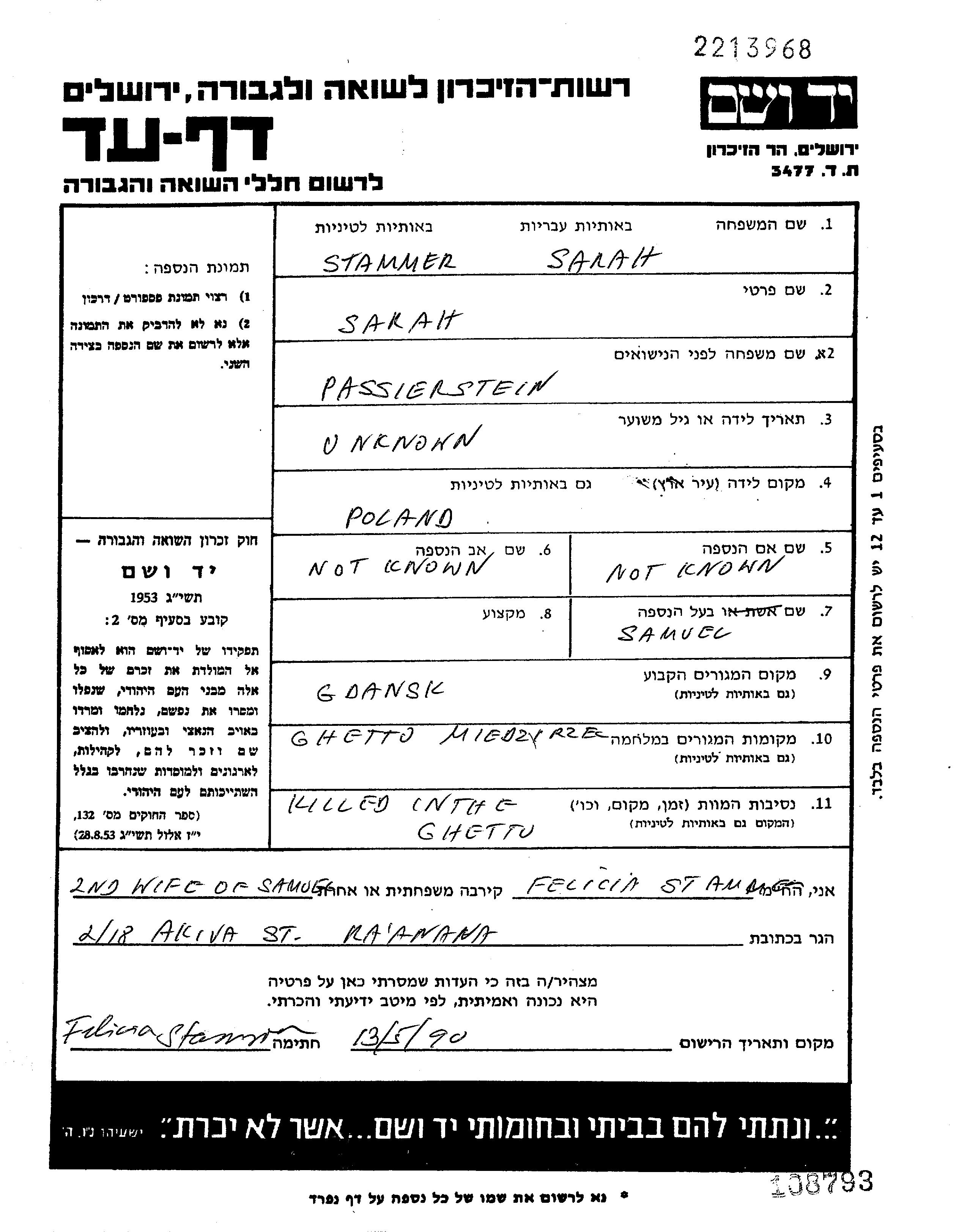 Sarah Stammer Shtemer, geb. Passierstein wurde in Polen geboren. Sie war mit Shmuel Verheiratet. Vor dem Zweiten Weltkrieg lebte sie in Gdansk, Freie Stadt Danzig. Während des Krieges war sie in Miedzyrzec, Polen.