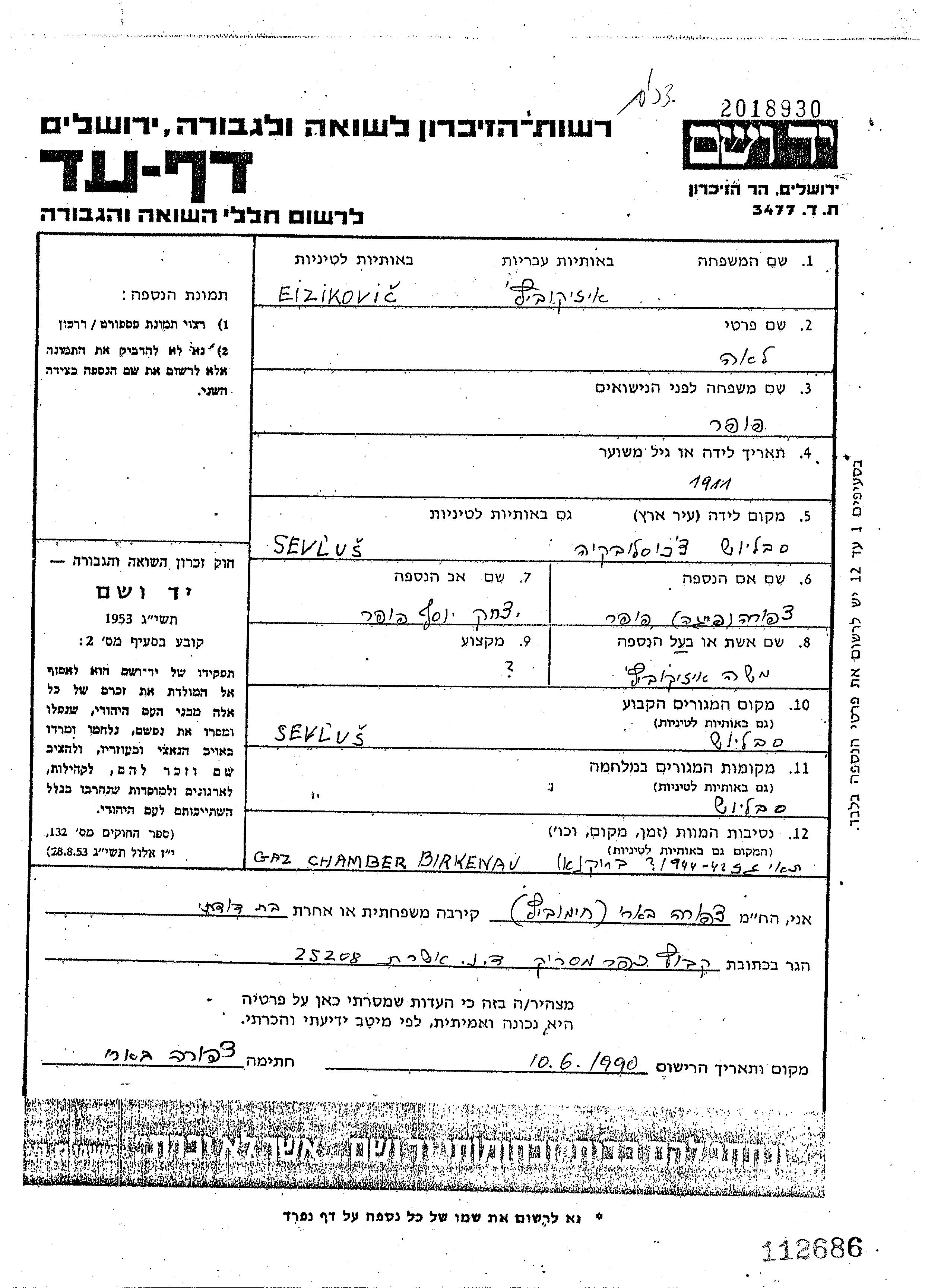 Lea Eizikovic, geb. Poper wurde im Jahr 1911 in Sevlus, Tschechoslowakei geboren. Sie war die Tochter von Ytzkhak Yosef und Tzipora Feiga. Sie war mit Moshe Verheiratet. Vor dem Zweiten Weltkrieg lebte sie in Sevlus, Tschechoslowakei. Während des Krieges war sie in Sevlus, Tschechoslowakei.