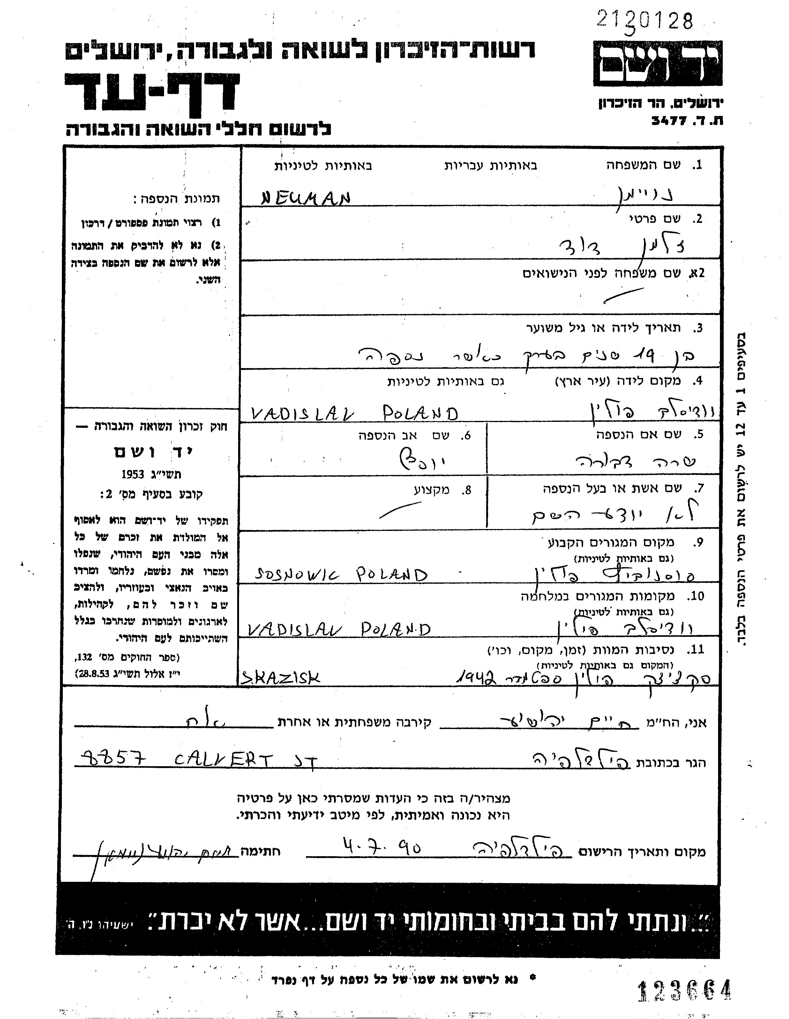 Zalman David Neuman wurde im Jahr 1923 in Wodzislaw, Polen geboren. Er war der Sohn von Josef und Sara Dvora, geb. Pinchevski. Vor dem Zweiten Weltkrieg lebte er in Sosnowiec, Polen. Während des Krieges war er in Wodzislaw, Polen.