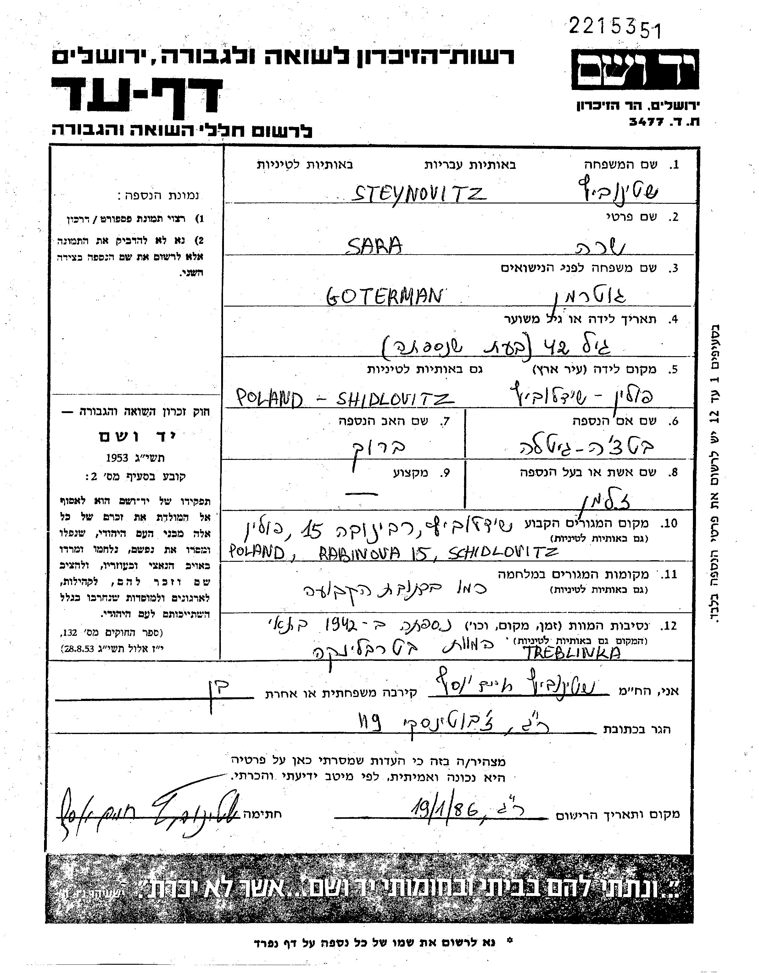 Sara Steynovitz, geb. Goterman wurde im Jahr 1900 in Szydlowiec, Polen geboren. Sie war die Tochter von Barukh und Betia Gitla. Sie war mit Zalman Baroch Verheiratet. Vor dem Zweiten Weltkrieg lebte sie in Szydlowiec, Polen. Während des Krieges war sie in Szydlowiec, Polen.