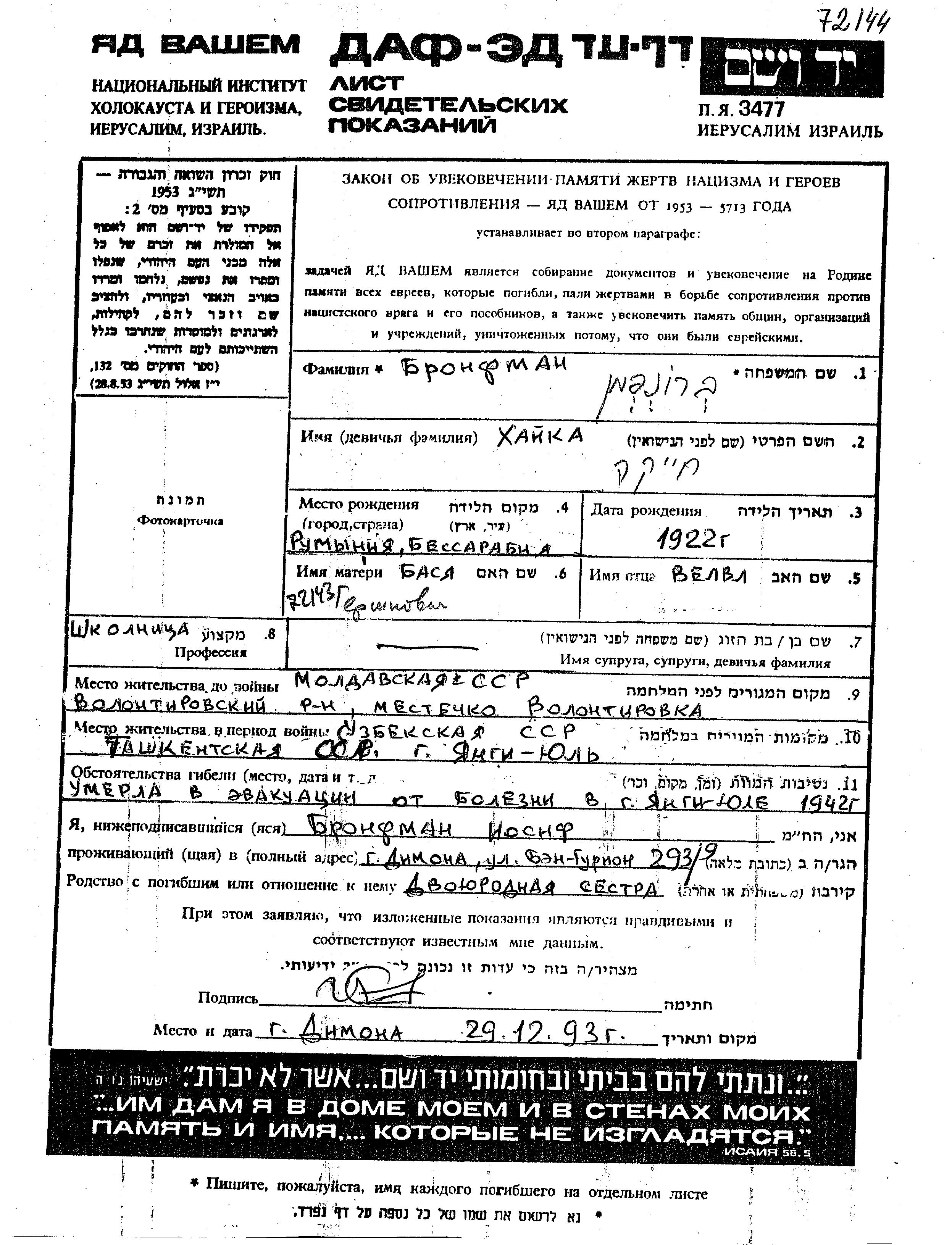 Bronfman Khaika 1922 Volintiri, Rumänien Gedenkblatt