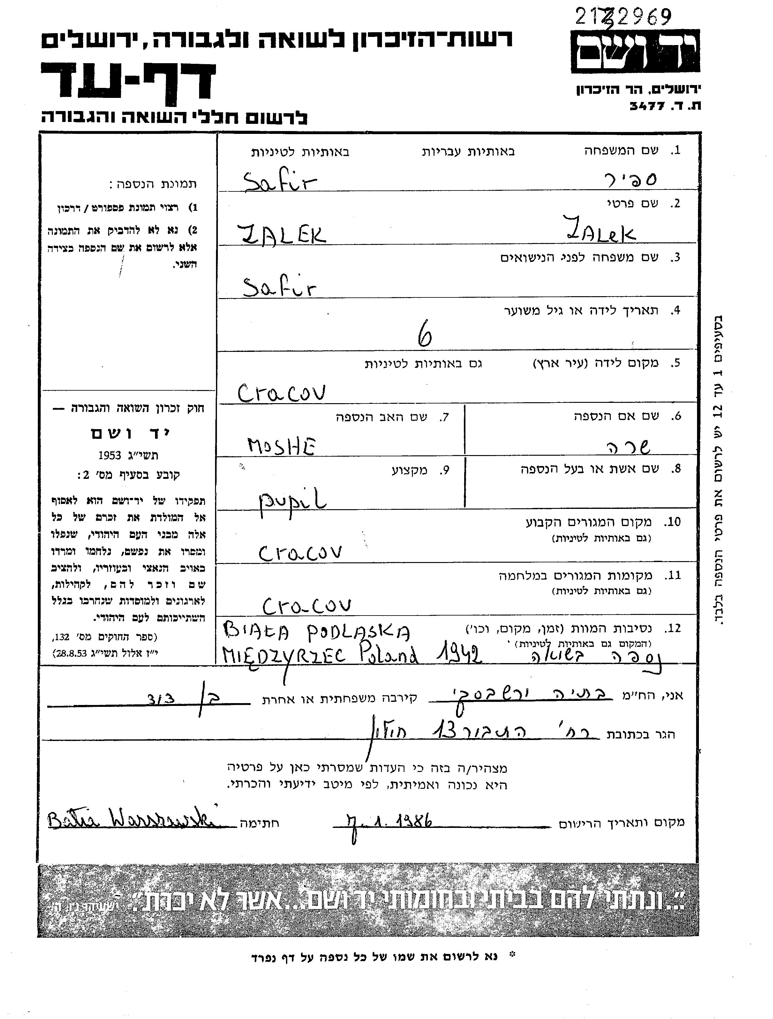 Zalek Safir wurde in Krakow, Polen geboren. Er war der Sohn von Moshe und Sara. Er war Schüler/-in und Kind. Vor dem Zweiten Weltkrieg lebte er in Krakow, Polen. Während des Krieges war er in Krakow, Polen.