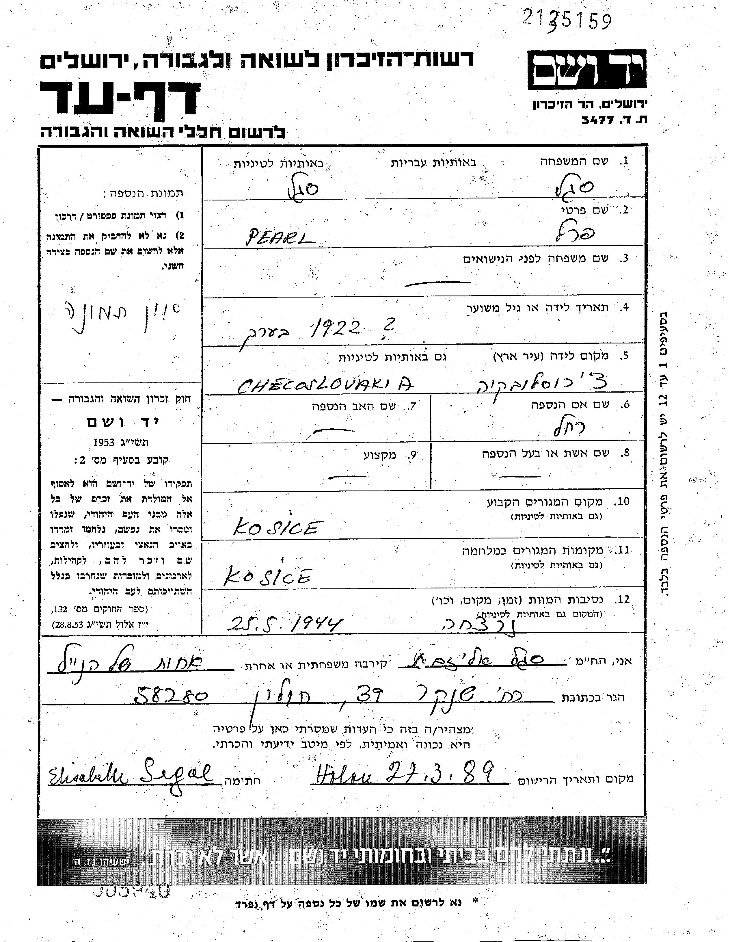 Pearl Segal wurde in Tschechoslowakei geboren. Sie war die Tochter von Rachel, geb. Schwarz. Vor dem Zweiten Weltkrieg lebte sie in Kosice, Tschechoslowakei. Während des Krieges war sie in Kosice, Tschechoslowakei.