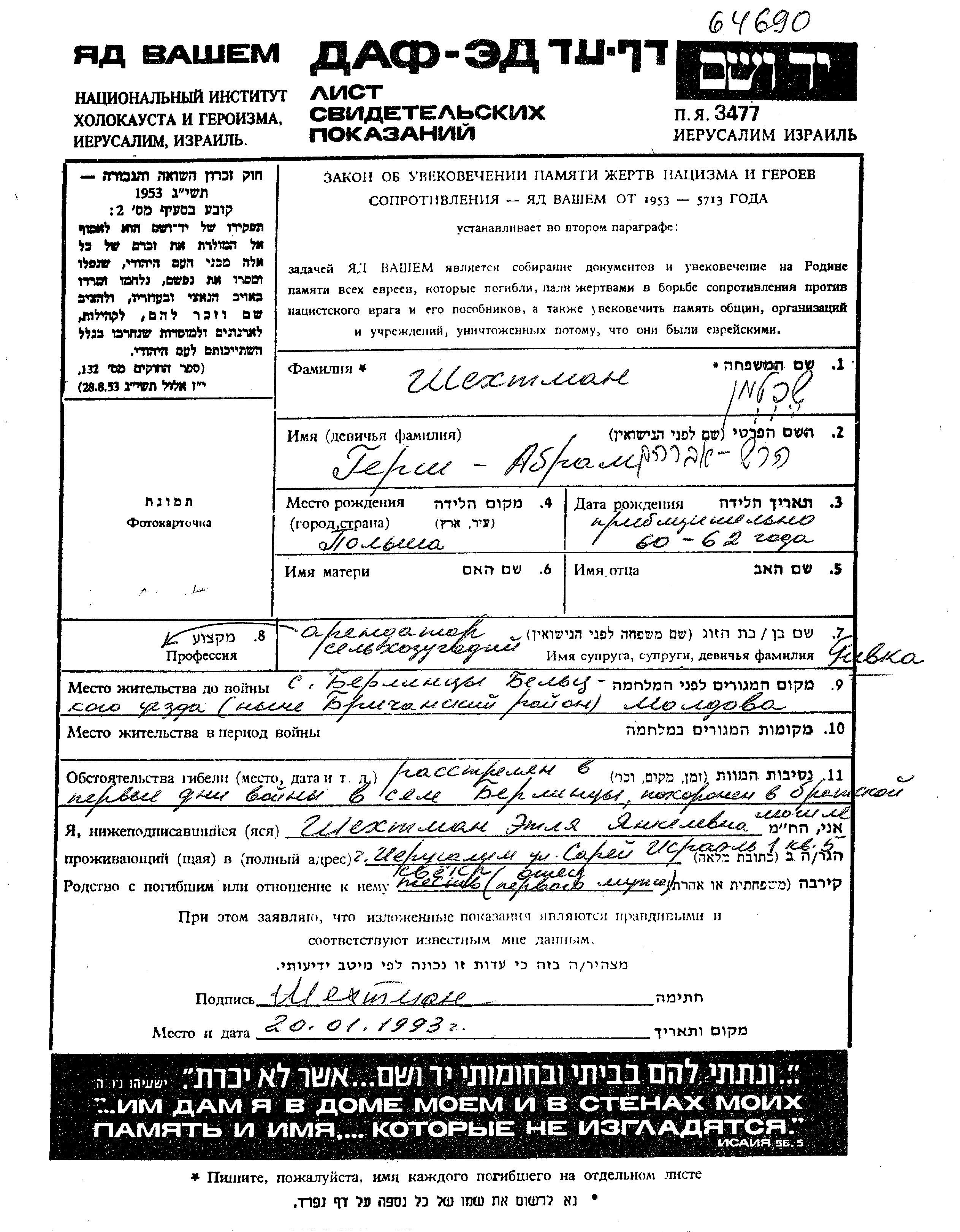 Hersh Abram Shekhtman wurde in Polen geboren. Er war Landwirt und mit Rivka Verheiratet. Vor dem Zweiten Weltkrieg lebte er in Berlinti, Rumänien. Während des Krieges war er in Berlinti, Rumänien.