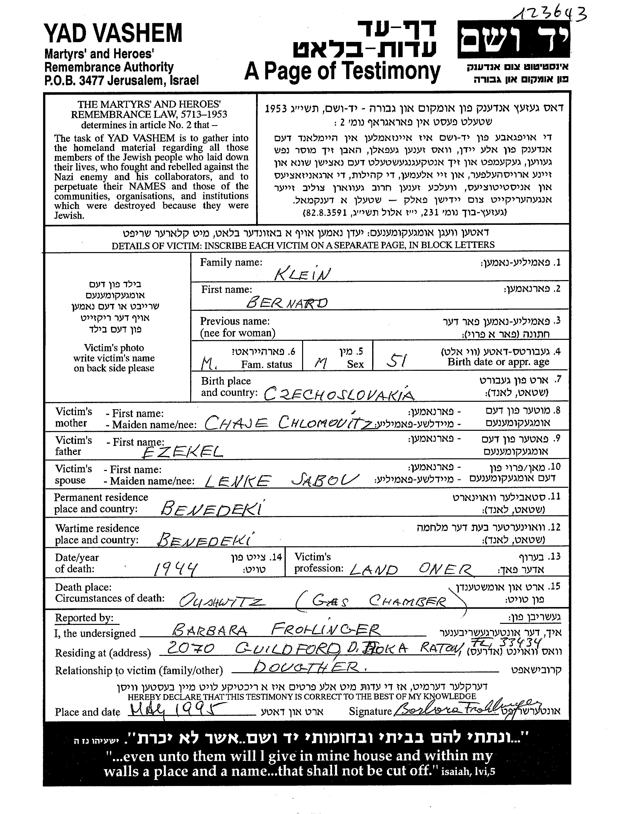 Bernard Klein wurde in Tschechoslowakei geboren. Er war der Sohn von Ezekel und Chaje, geb. Chlomovitz. Er war Landbesitzer und mit Lenke Verheiratet. Vor dem Zweiten Weltkrieg lebte er in Benedeki, Tschechoslowakei. Während des Krieges war er in Benedeki, Tschechoslowakei.