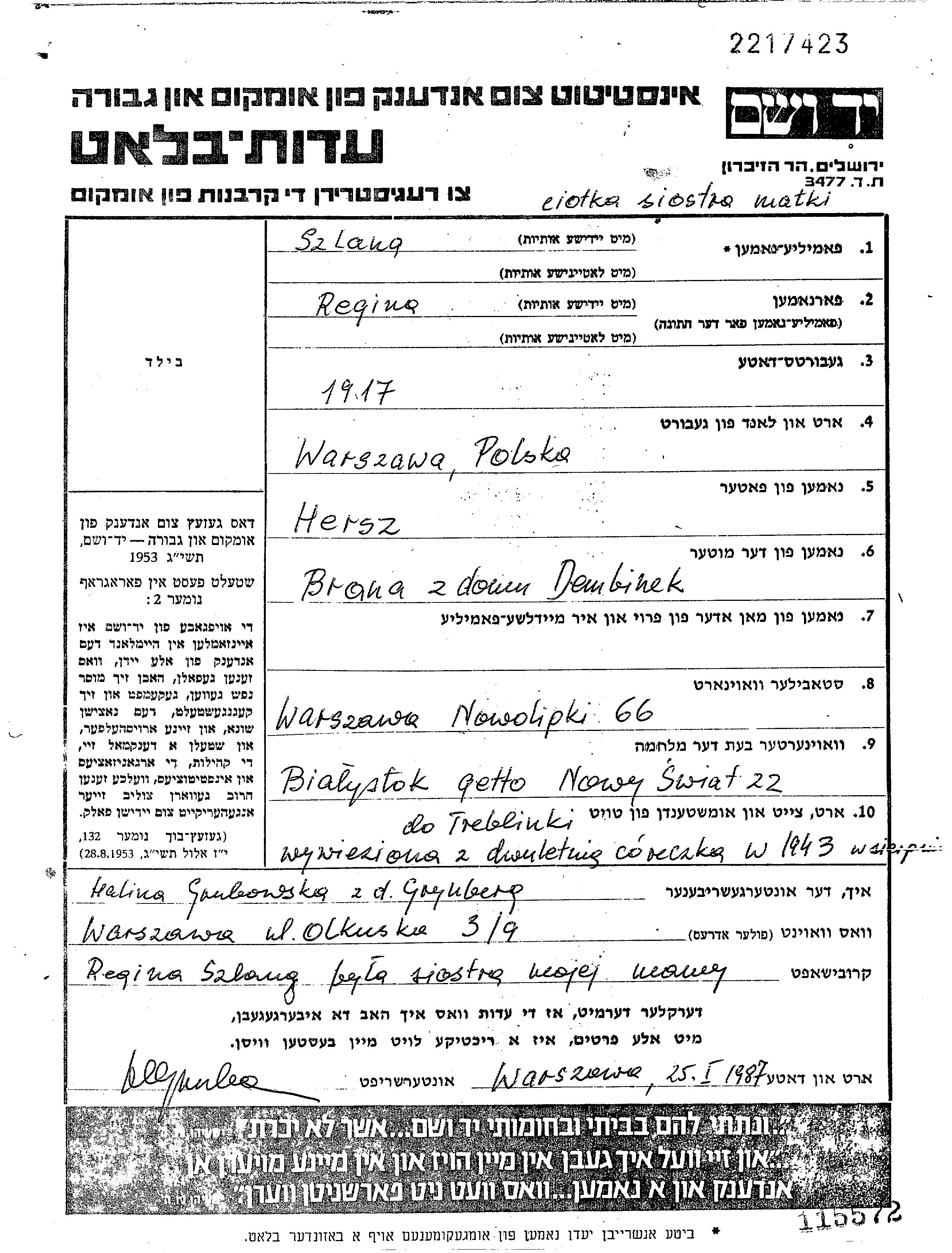 Regina Szlang wurde in Warszawa, Polen geboren. Sie war die Tochter von Hersz und Brana, geb. Dembinek. Sie war Verheiratet. Vor dem Zweiten Weltkrieg lebte sie in Warszawa, Polen. Während des Krieges war sie in Bialystok, Polen.