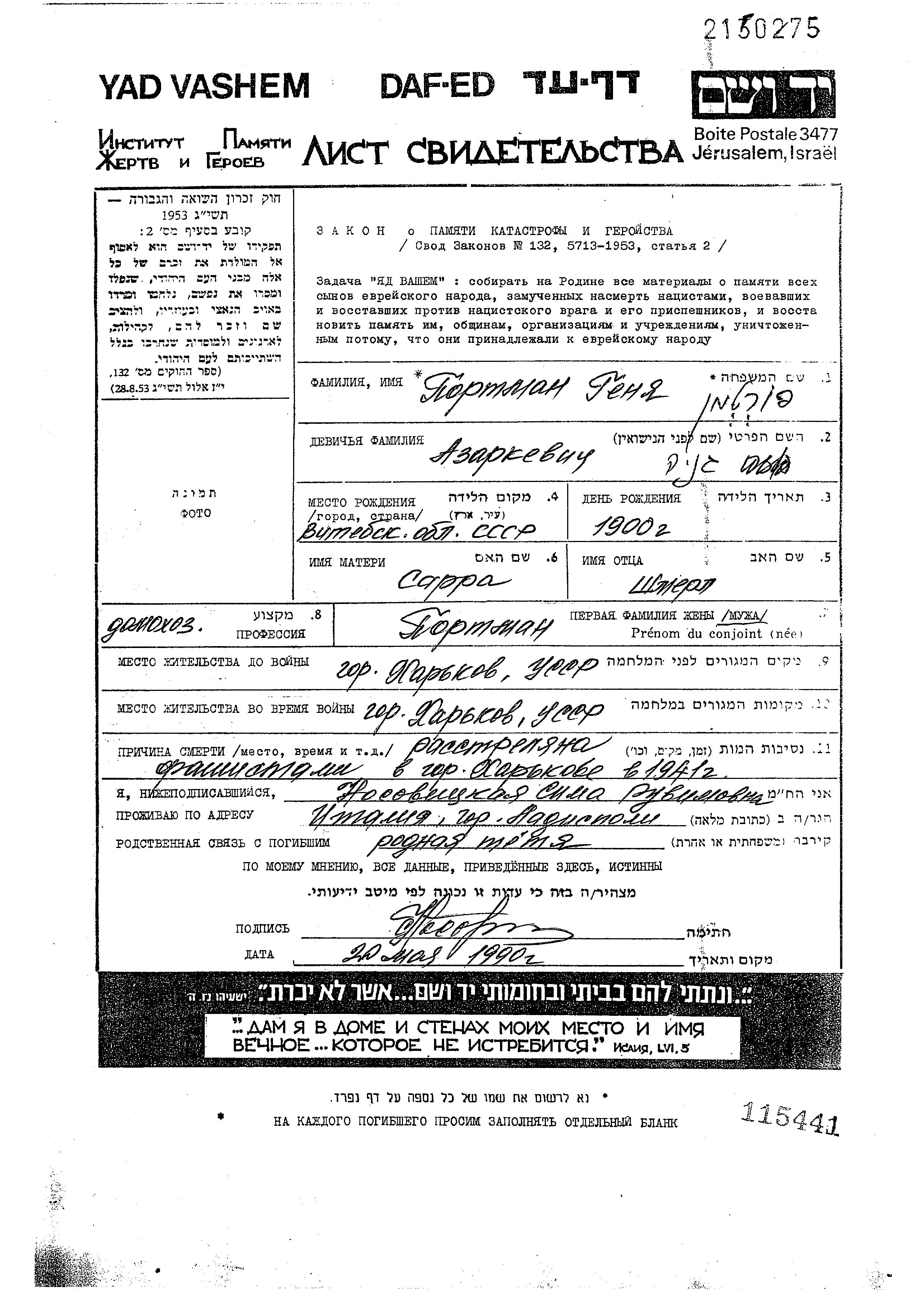 Genya Portman, geb. Azarkevich wurde in Vitebsk, Weißrussland (UdSSR) geboren. Sie war die Tochter von Shmariahu und Sara. Sie war Hausfrau und mit Nakhum Verheiratet. Vor dem Zweiten Weltkrieg lebte sie in Kharkov, Ukraine (UdSSR). Während des Krieges war sie in Kharkov, Ukraine (UdSSR).
