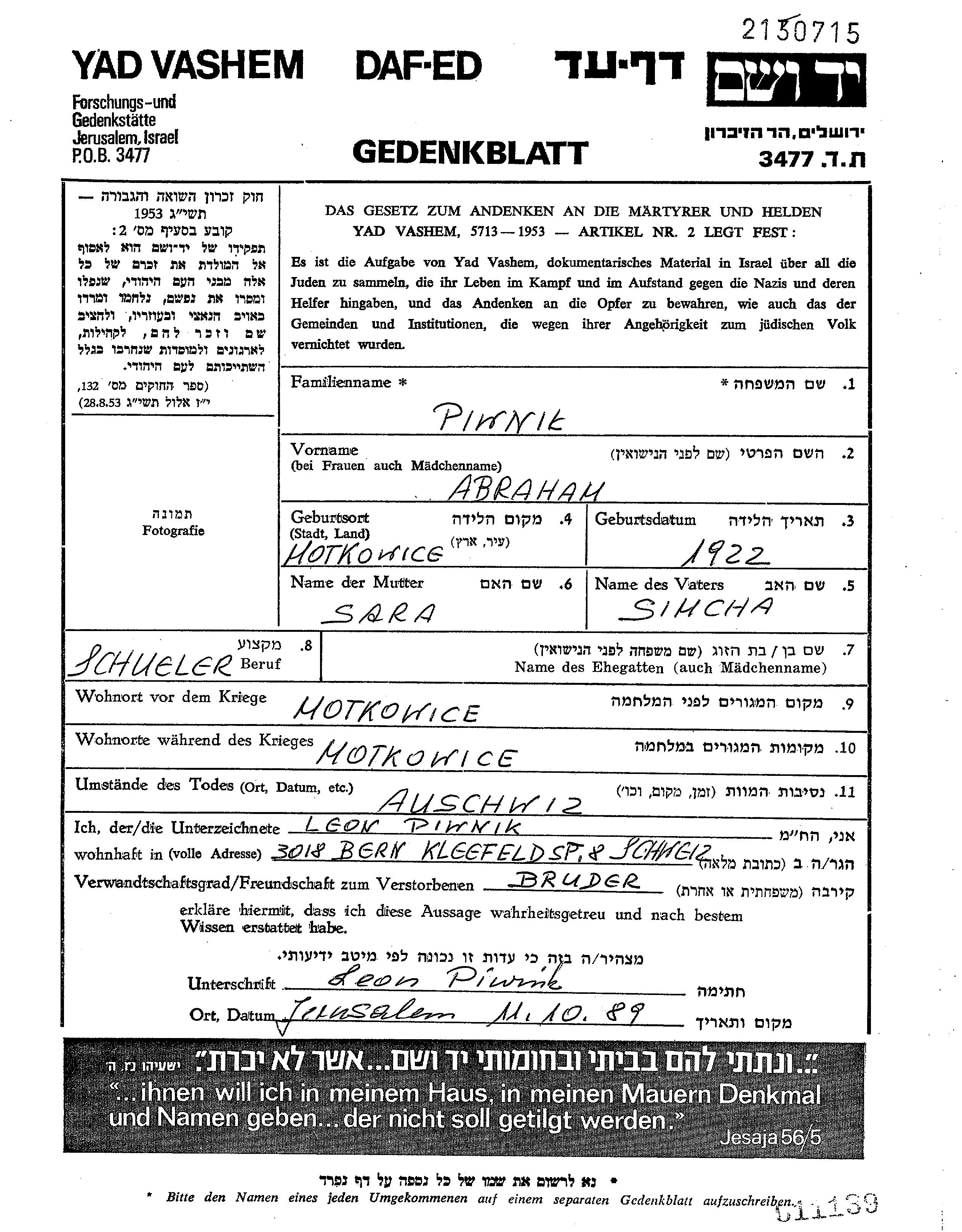Abraham Piwnik wurde in Motkowice, Polen geboren. Er war der Sohn von Simcha und Sara, geb. Nowarski. Er war Schüler/-in und Ledig. Vor dem Zweiten Weltkrieg lebte er in Motkowice, Polen. Während des Krieges war er in Motkowice, Polen.