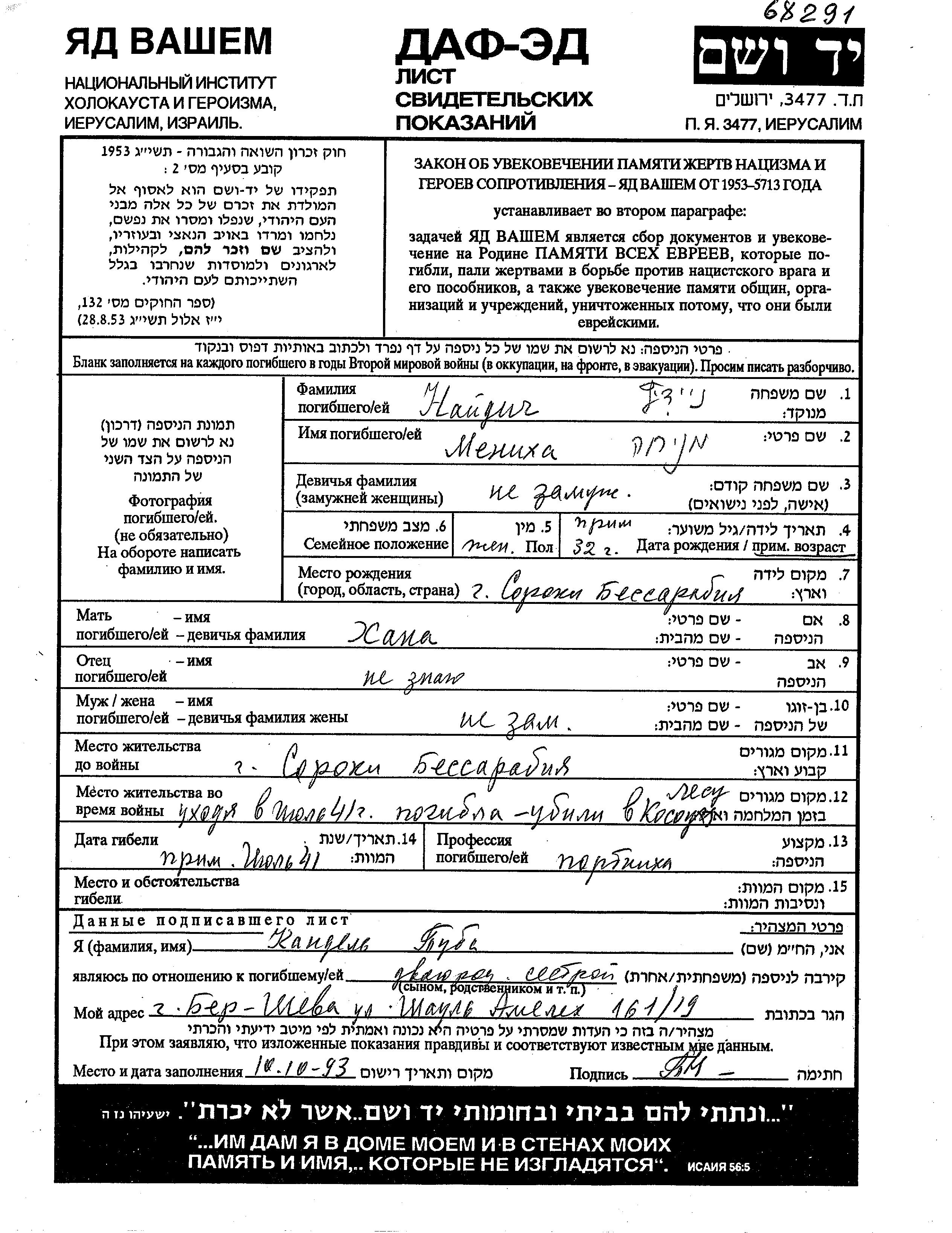Menukha wurde in der Schoah ermordet. Todesort: Bessarabia, Rumänien im Jahr 1941.