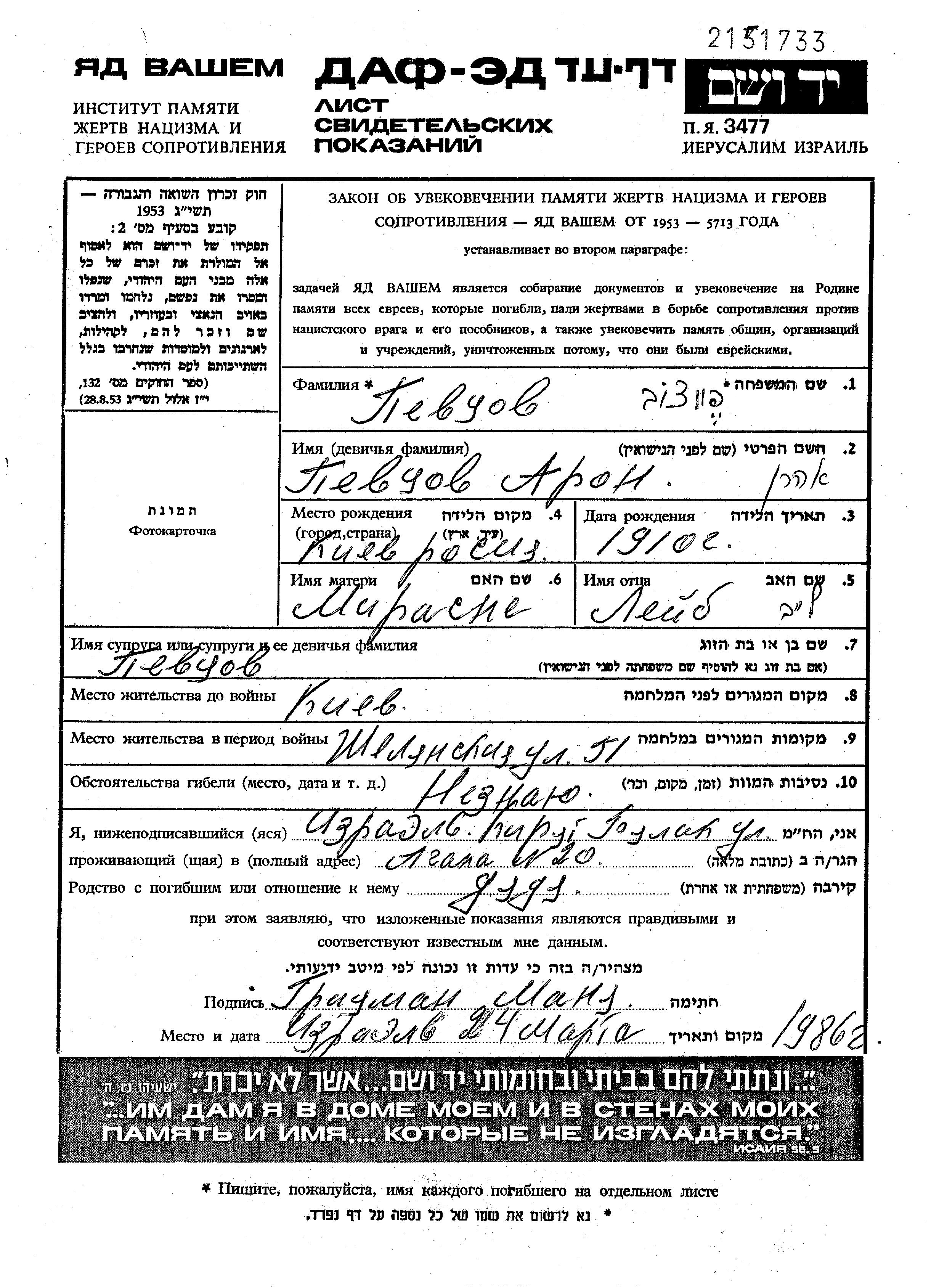 Aron Pevtzov wurde im Jahr 1910 in Kiyev, Ukraine (UdSSR) geboren. Er war der Sohn von Leib und Mirasne. Vor dem Zweiten Weltkrieg lebte er in Kiyev, Ukraine (UdSSR). Während des Krieges war er in Kiyev, Ukraine (UdSSR).