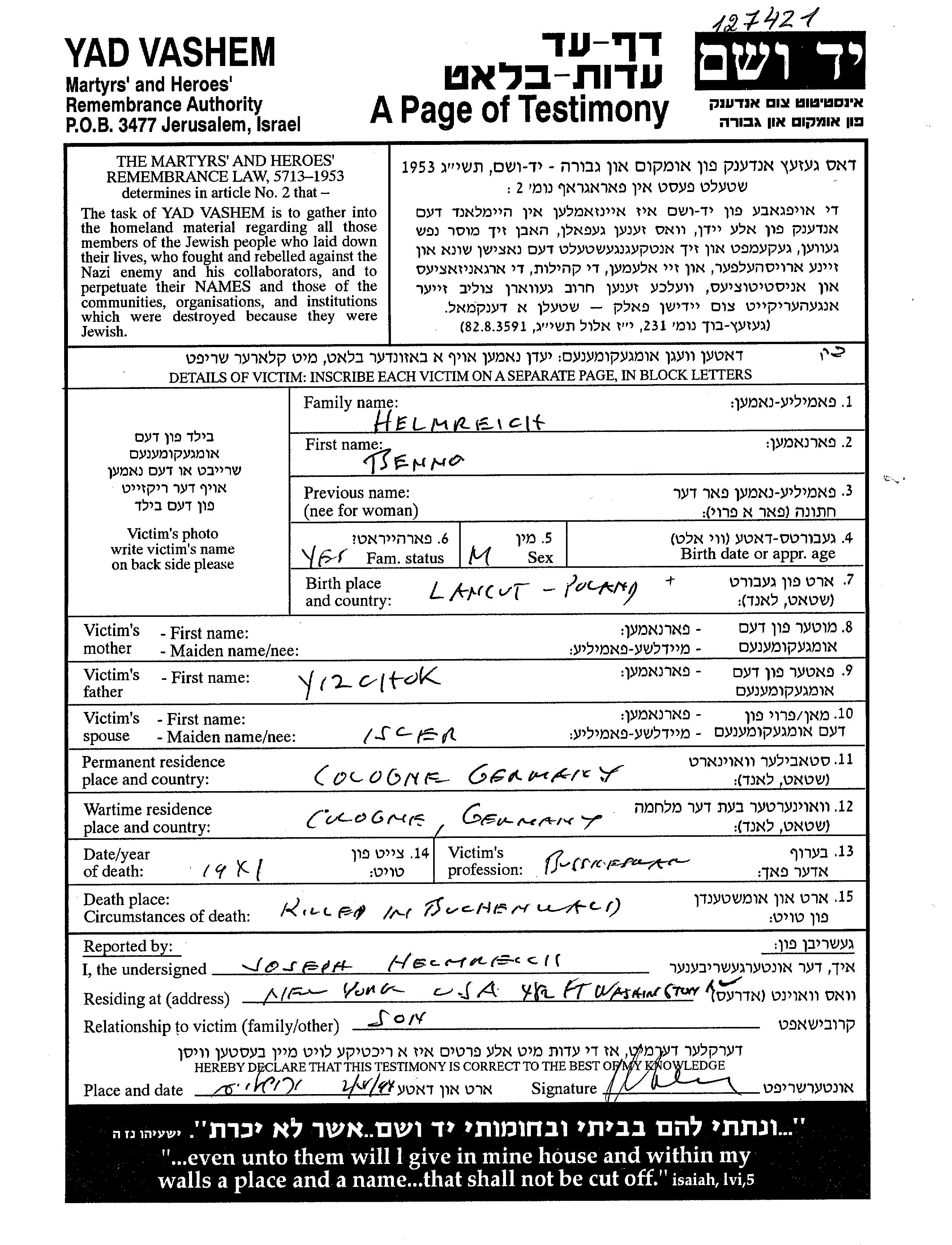 Benno Beno Helmreich wurde in Lancut, Polen geboren. Er war der Sohn von Yizchok. Er war Geschäftsmann und Verheiratet. Vor dem Zweiten Weltkrieg lebte er in Cologne, Deutsches Reich. Während des Krieges war er in Cologne, Deutsches Reich.