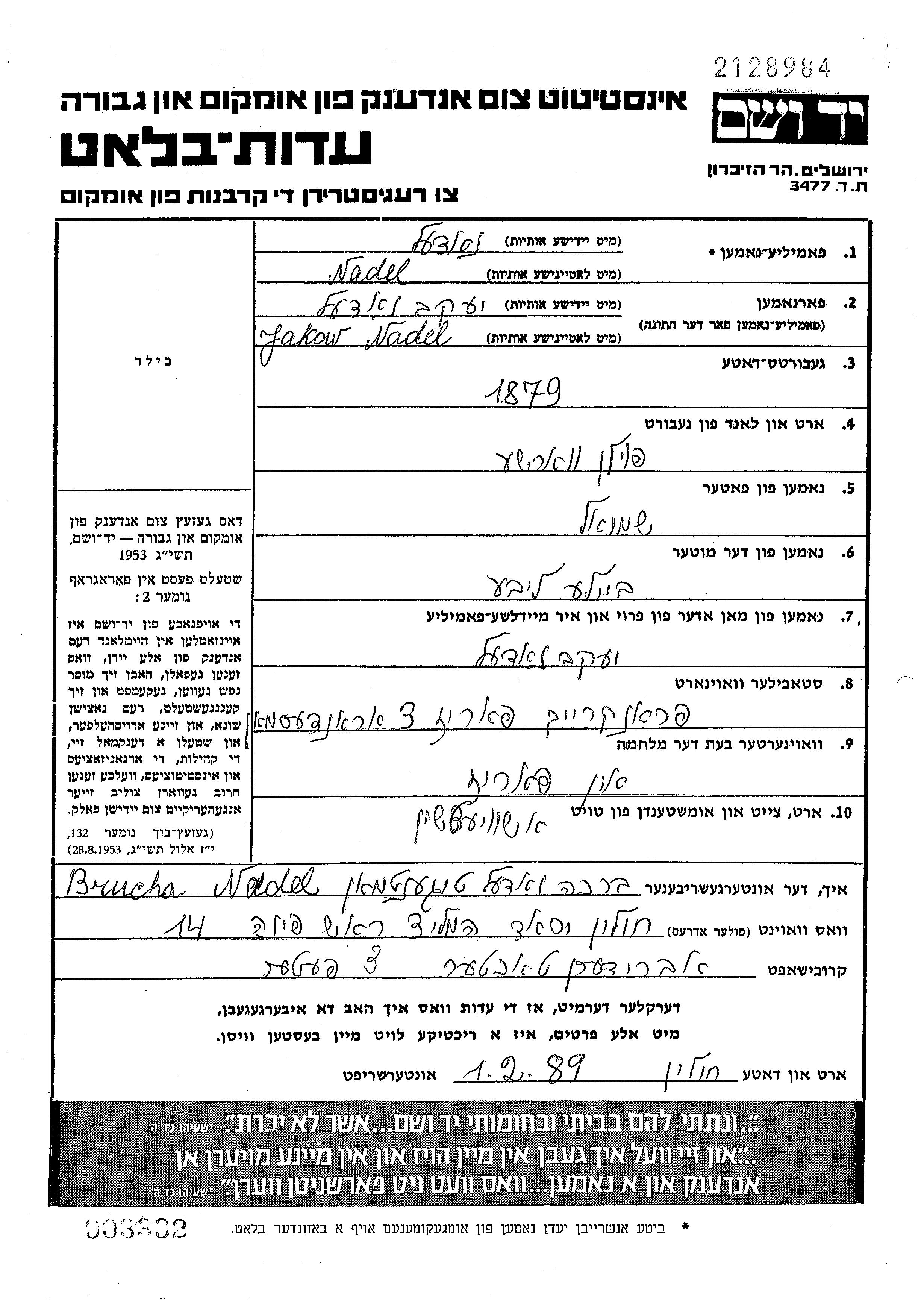 Jakow Nadel wurde im Jahr 1879 in Warszawa, Polen geboren. Er war der Sohn von Shmuel und Beile Liba. Vor dem Zweiten Weltkrieg lebte er in Paris, Frankreich. Während des Krieges war er in Paris, Frankreich.