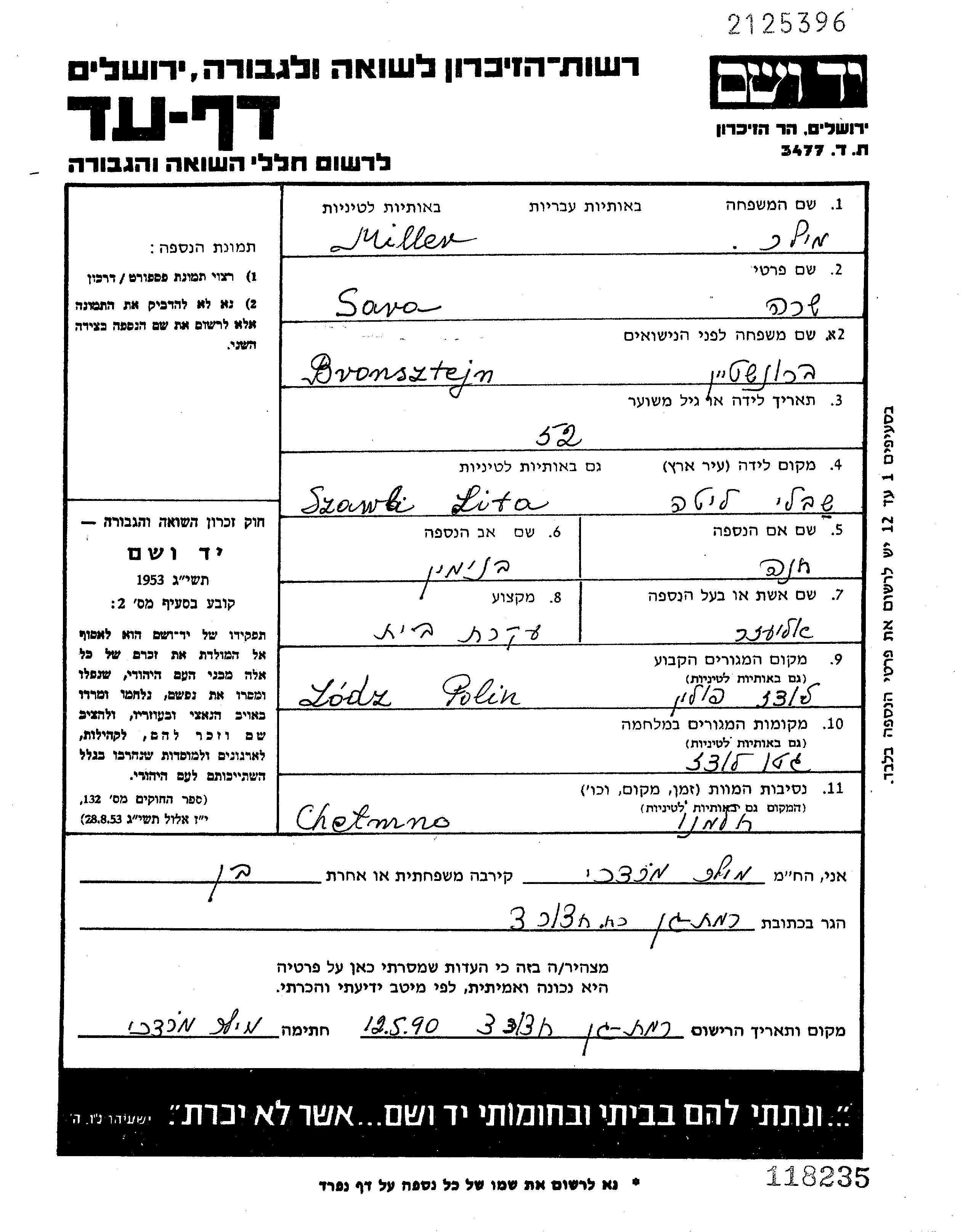 Sara Miller, geb. Bronsztejn wurde in Siauliai, Litauen geboren. Sie war die Tochter von Beniamin und Khana. Sie war Hausfrau und mit Eliezer Verheiratet. Vor dem Zweiten Weltkrieg lebte sie in Lodz, Polen. Während des Krieges war sie in Lodz, Polen.
