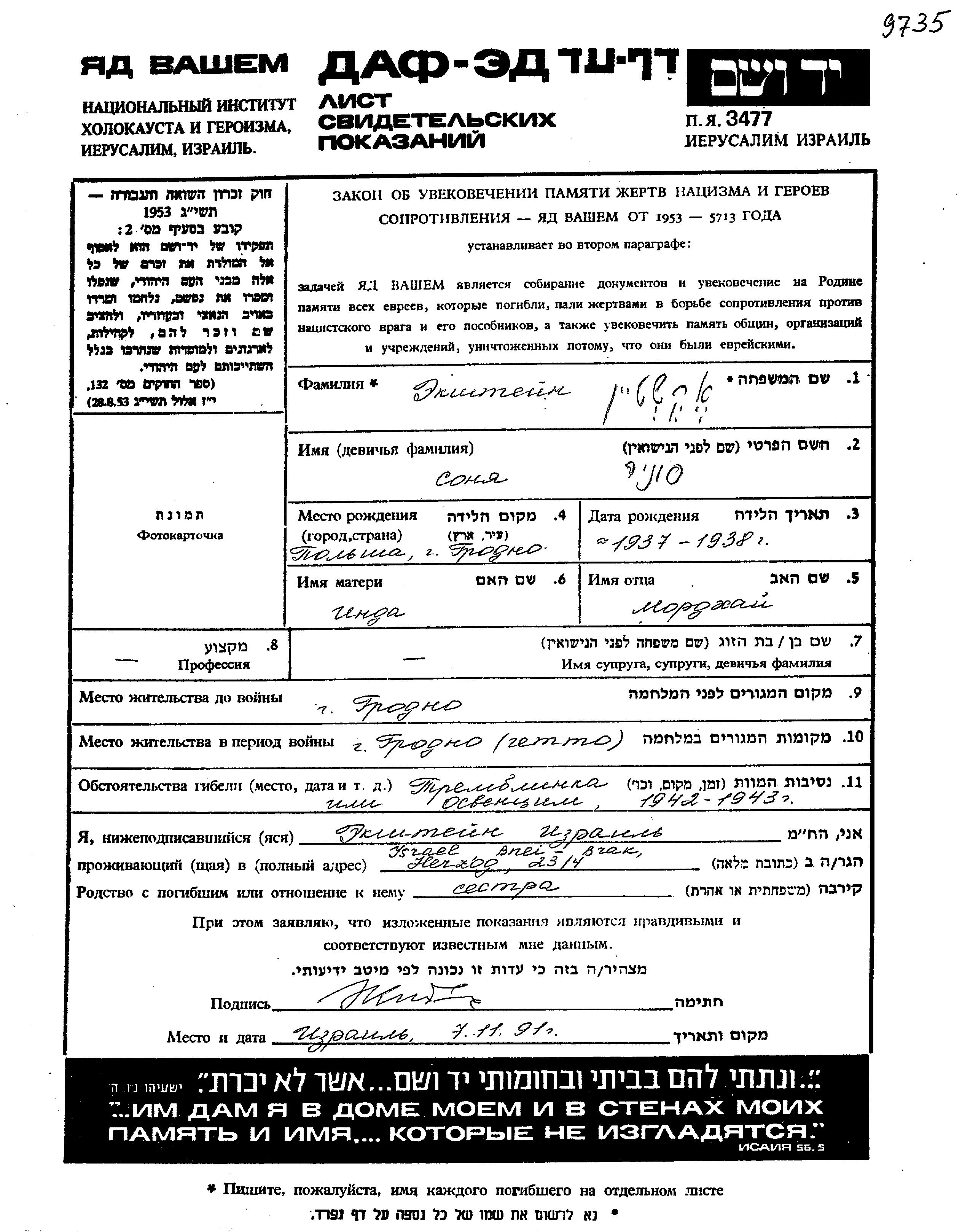 Ekshtein Sonia 1937 Grodno, Polen Gedenkblatt
