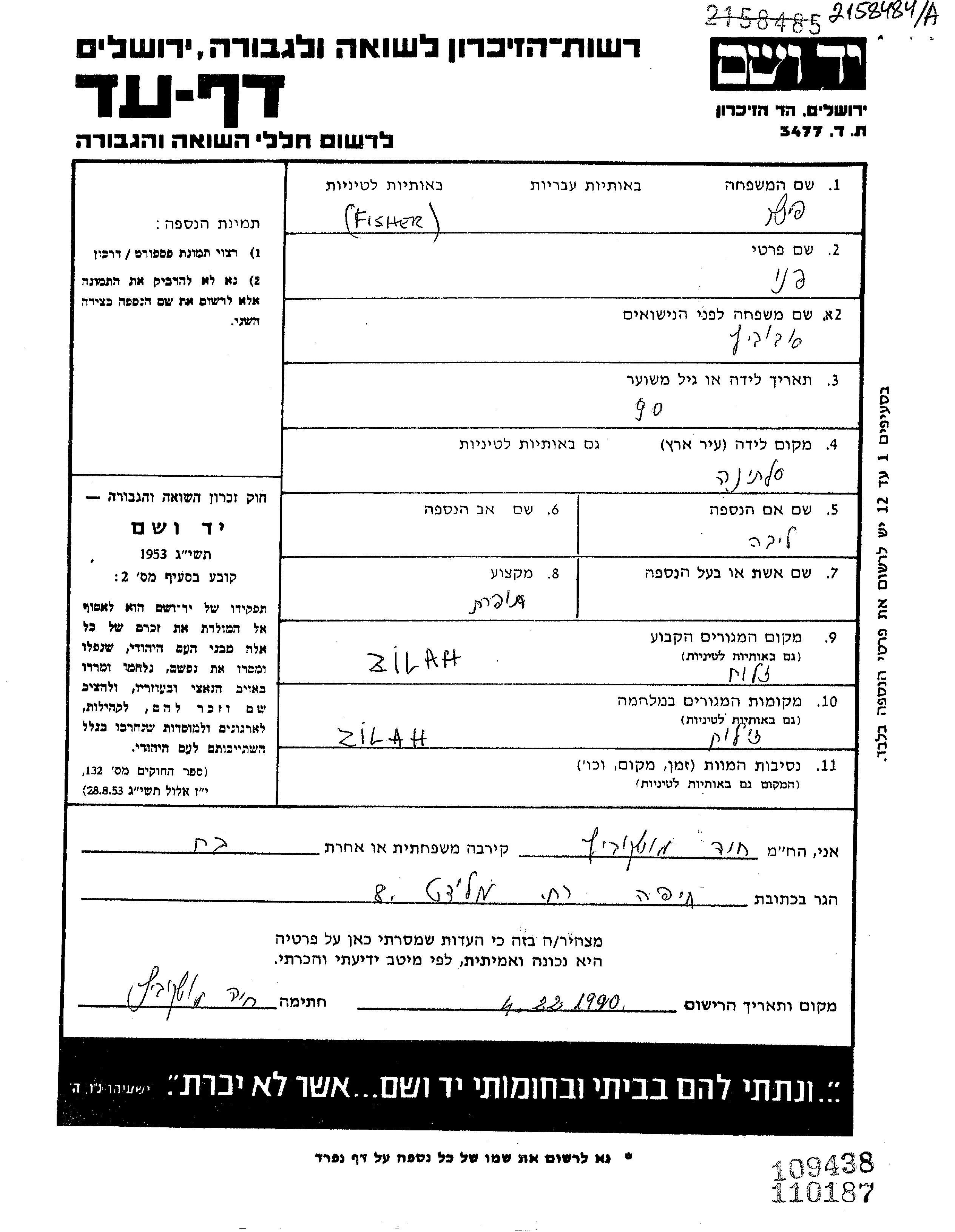 Fani Fischer, geb. Sobovits wurde im Jahr 1880 in Slatina, Tschechoslowakei geboren. Sie war die Tochter von Liba. Sie war mit Fishel Verheiratet. Vor dem Zweiten Weltkrieg lebte sie in Zilah, Rumänien. Während des Krieges war sie in Zilah, Rumänien.