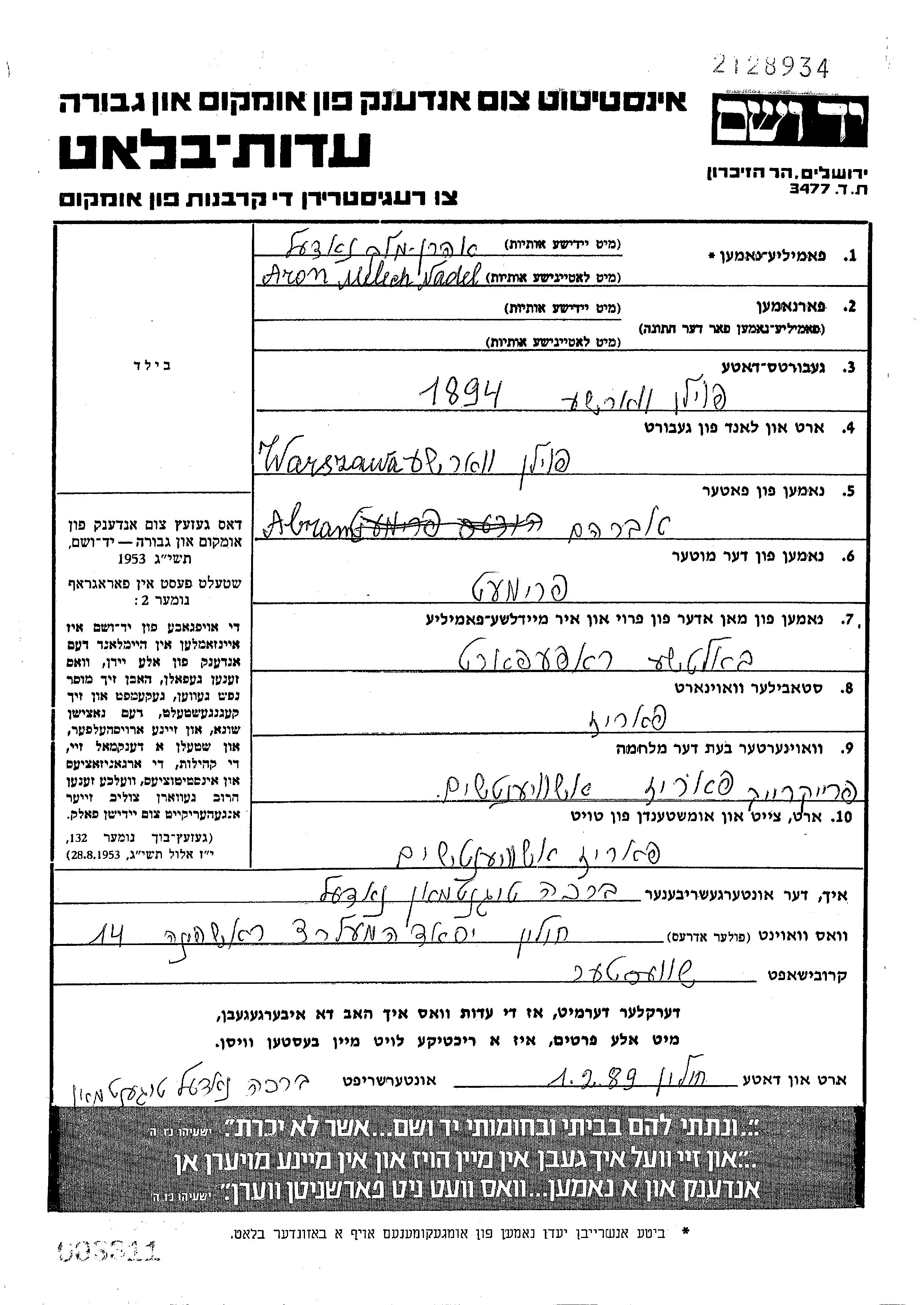 Aron Melech Nadel wurde im Jahr 1894 in Warszawa, Polen geboren. Er war der Sohn von Abram und Frimet. Er war mit Bela Verheiratet. Vor dem Zweiten Weltkrieg lebte er in Paris, Frankreich. Während des Krieges war er in Paris, Frankreich.