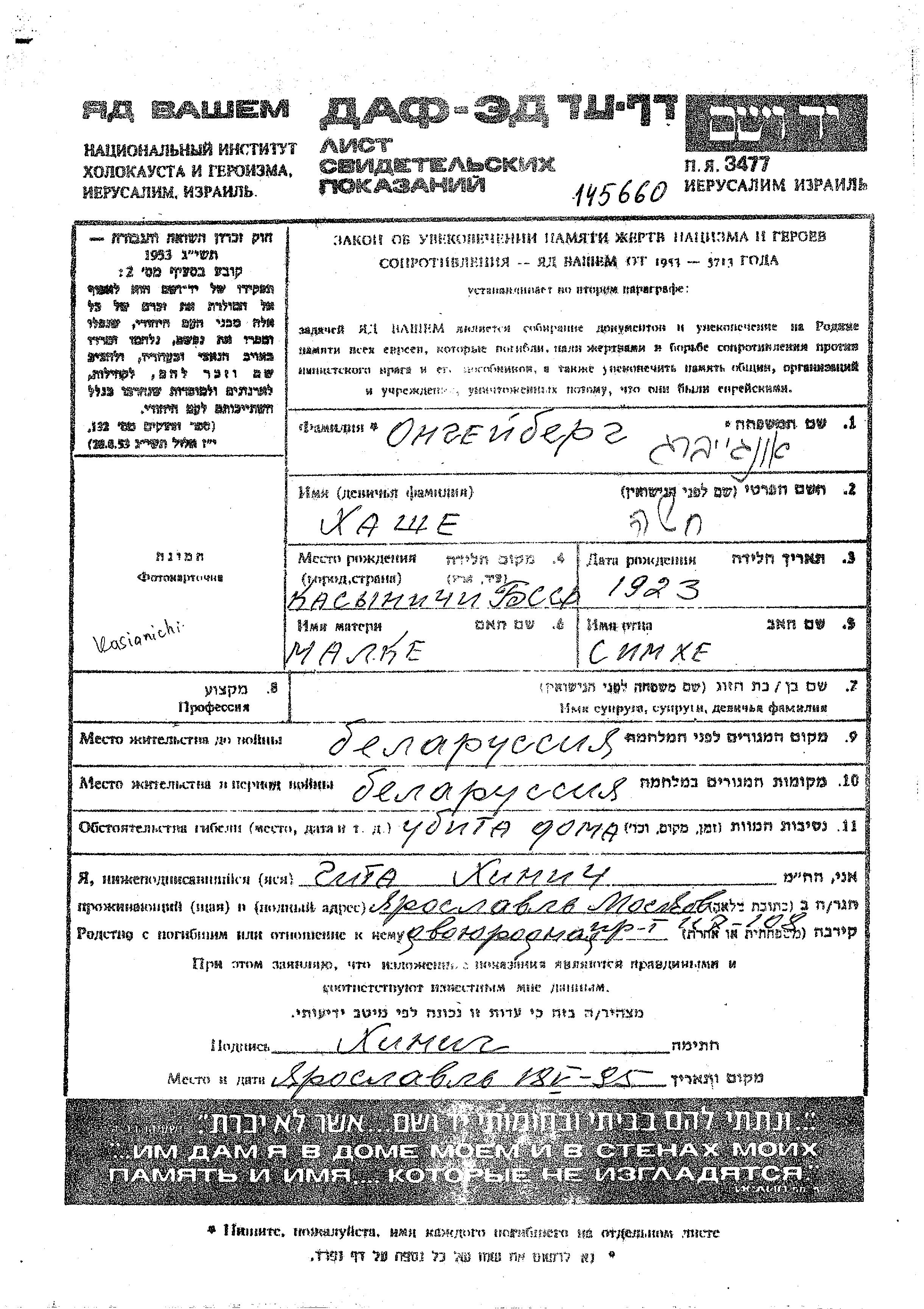 Khashe Ongeyberg wurde im Jahr 1923 in Kasynichy, Weißrussland (UdSSR) geboren. Sie war die Tochter von Simkhe und Malke. Vor dem Zweiten Weltkrieg lebte sie in Weißrussland (UdSSR). Während des Krieges war sie in Weißrussland (UdSSR).