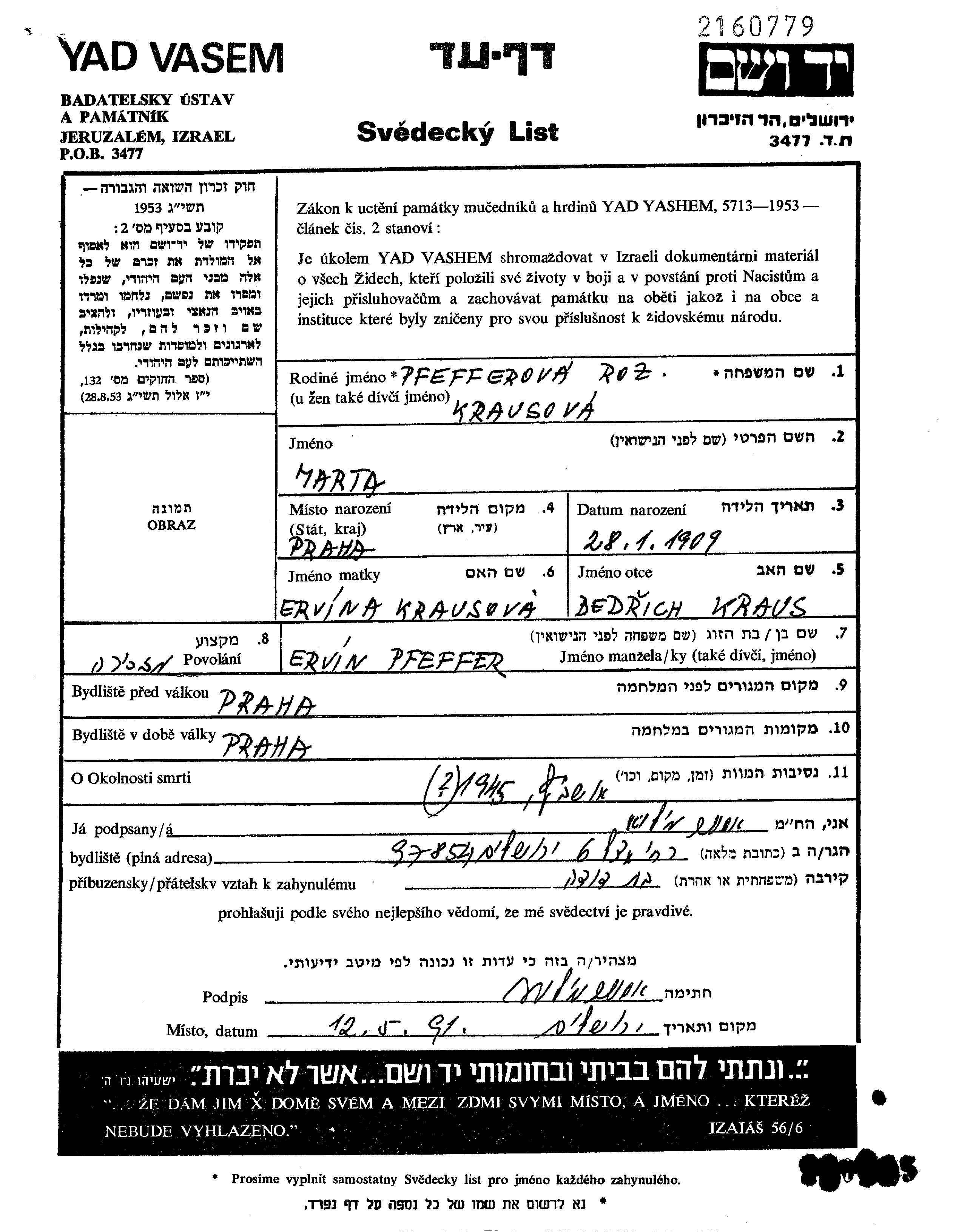 Marta Pfeffer, geb. Kraus wurde im Jahr 1909 in Praha, Tschechoslowakei geboren. Sie war die Tochter von Bedrich und Ervina, geb. Kraus. Sie war Sekretär/-in und mit Ervin Verheiratet. Vor dem Zweiten Weltkrieg lebte sie in Praha, Tschechoslowakei. Während des Krieges war sie in Praha, Tschechoslowakei.