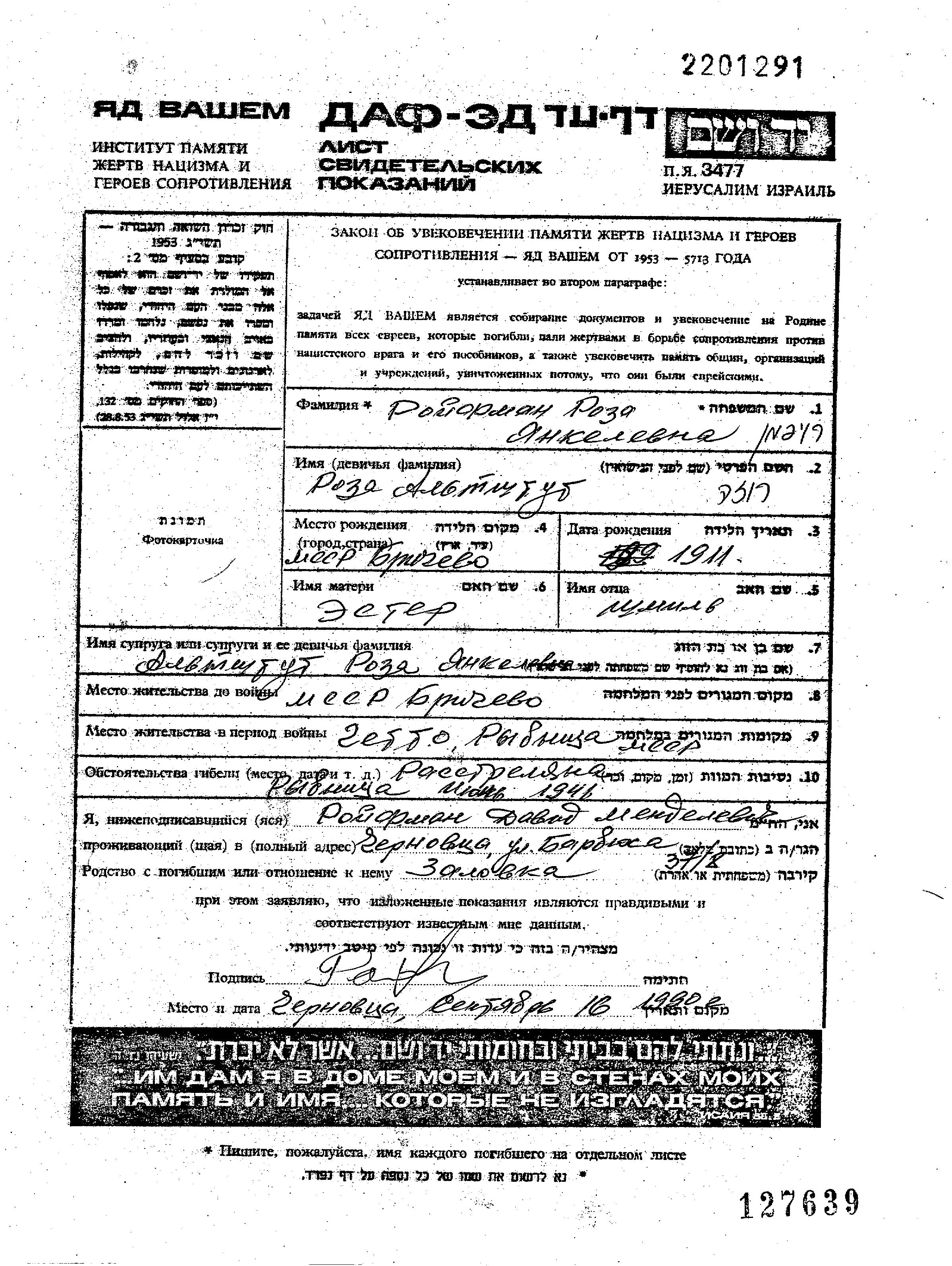 Roifman Roza 1911 Briceva, Rumänien Gedenkblatt