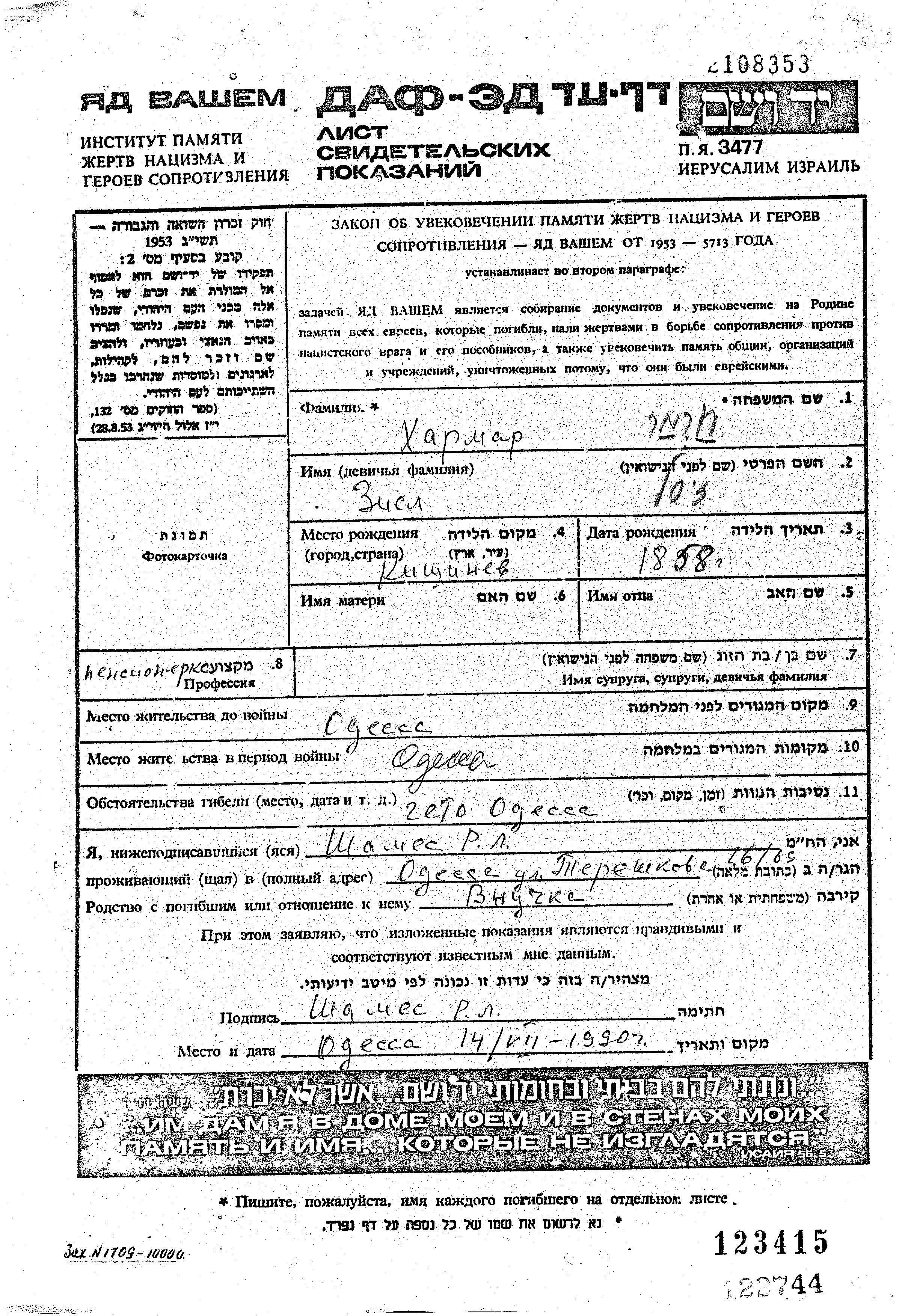 Zisl Kharmar wurde in Kishinev, Rumänien geboren. Sie war Rentner/-in. Vor dem Zweiten Weltkrieg lebte sie in Odessa, Ukraine (UdSSR). Während des Krieges war sie in Odessa, Ukraine (UdSSR).