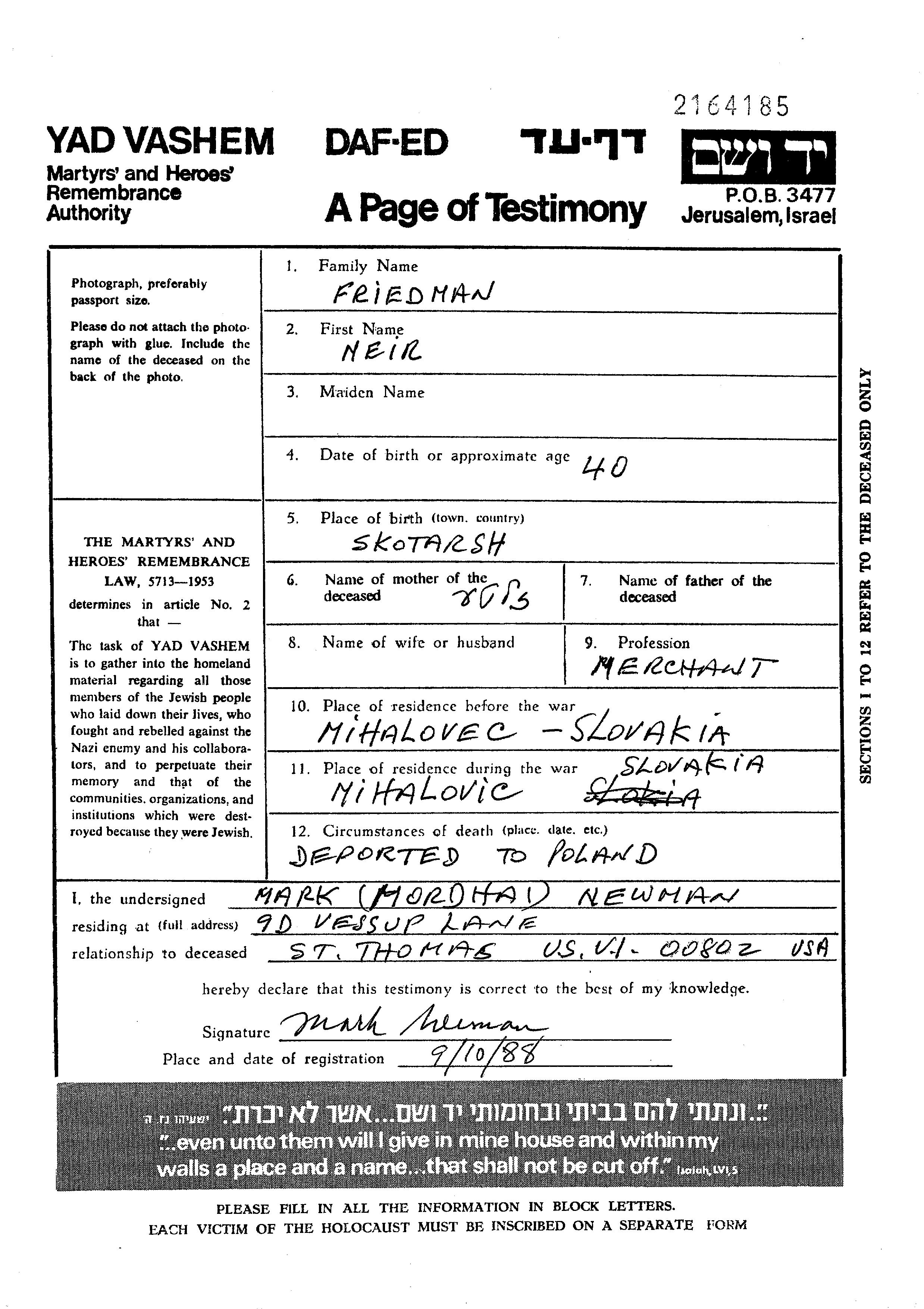 Meir Friedman wurde in Skotarsk, Tschechoslowakei geboren. Er war der Sohn von Zlate. Er war Kaufmann/-frau. Vor dem Zweiten Weltkrieg lebte er in Michalovce, Tschechoslowakei. Während des Krieges war er in Michalovce, Tschechoslowakei.