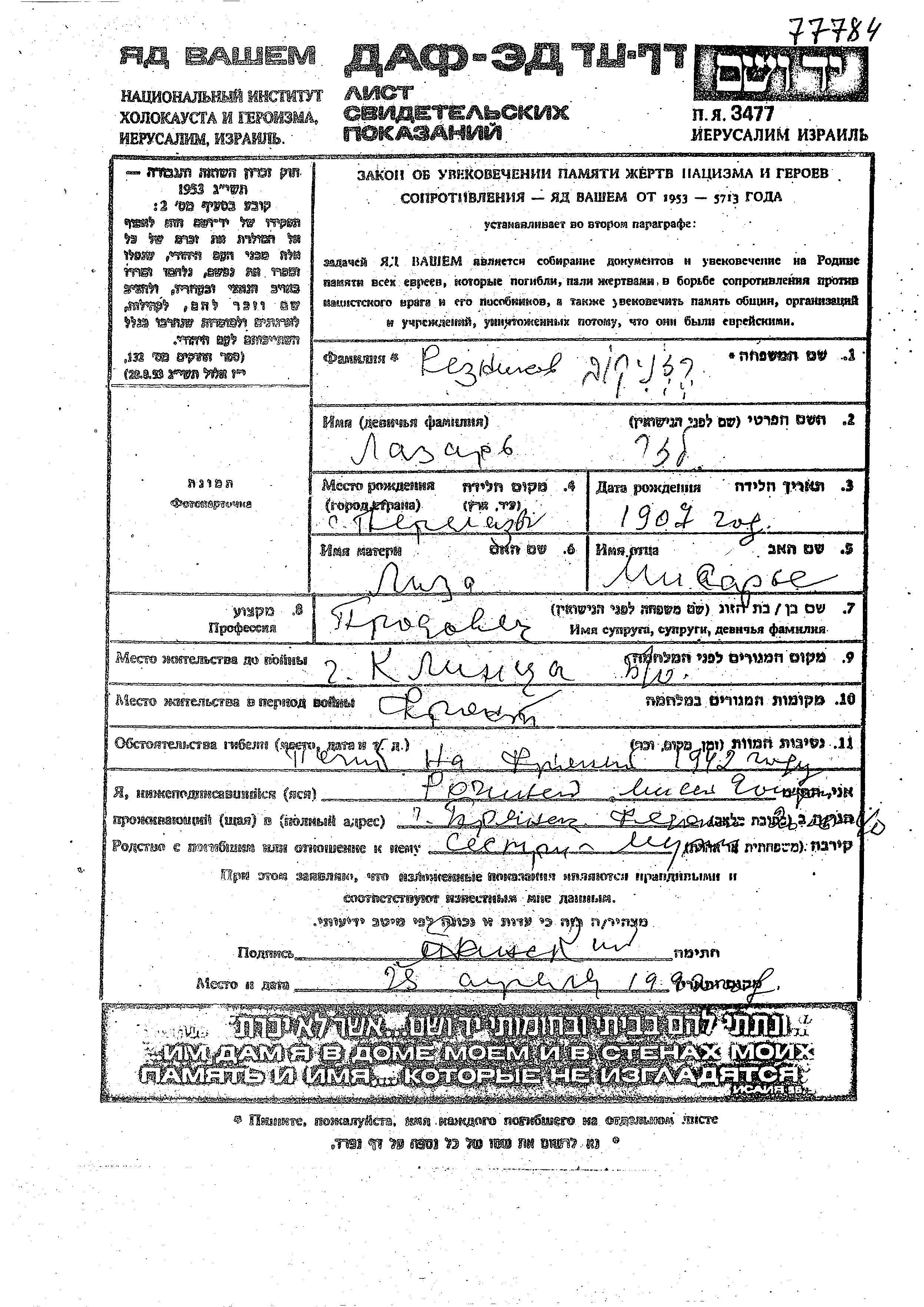 Lazar Reznikov wurde im Jahr 1907 in Perelazy, Russland (UdSSR) geboren. Er war der Sohn von Misarye Arie und Liza. Er war Verkäufer/-in. Vor dem Zweiten Weltkrieg lebte er in Klintsy, Russland (UdSSR). Während des Krieges war er in die Sowjetischen Streitkräfte. Lazar im Militärdienst umgekommen. Todesort: unbekannt im Jahr 1942.