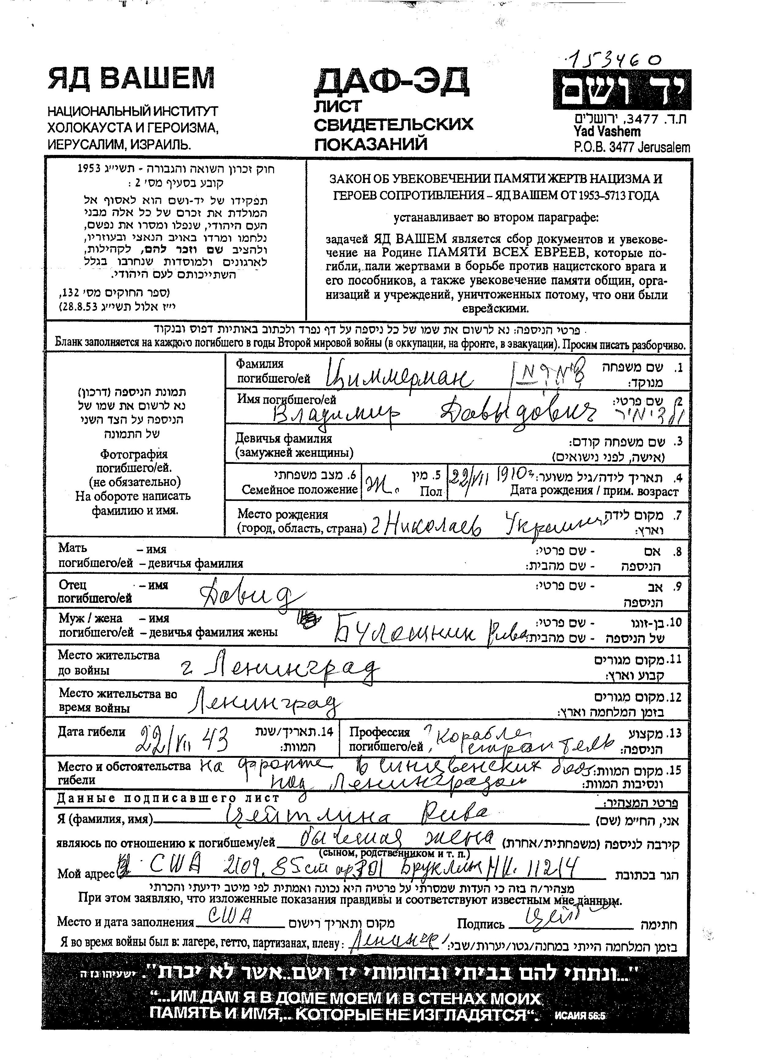 Vladimir Tzimerman wurde im Jahr 1910 in Nikolayev, Ukraine (UdSSR) geboren. Er war der Sohn von David. Er war mit Riva Verheiratet. Vor dem Zweiten Weltkrieg lebte er in Leningrad, Russland (UdSSR). Während des Krieges war er in die Sowjetischen Streitkräfte. Vladimir im Militärdienst umgekommen. Todesort: Leningrad, Russland (UdSSR) im Jahr 22/07/1943.