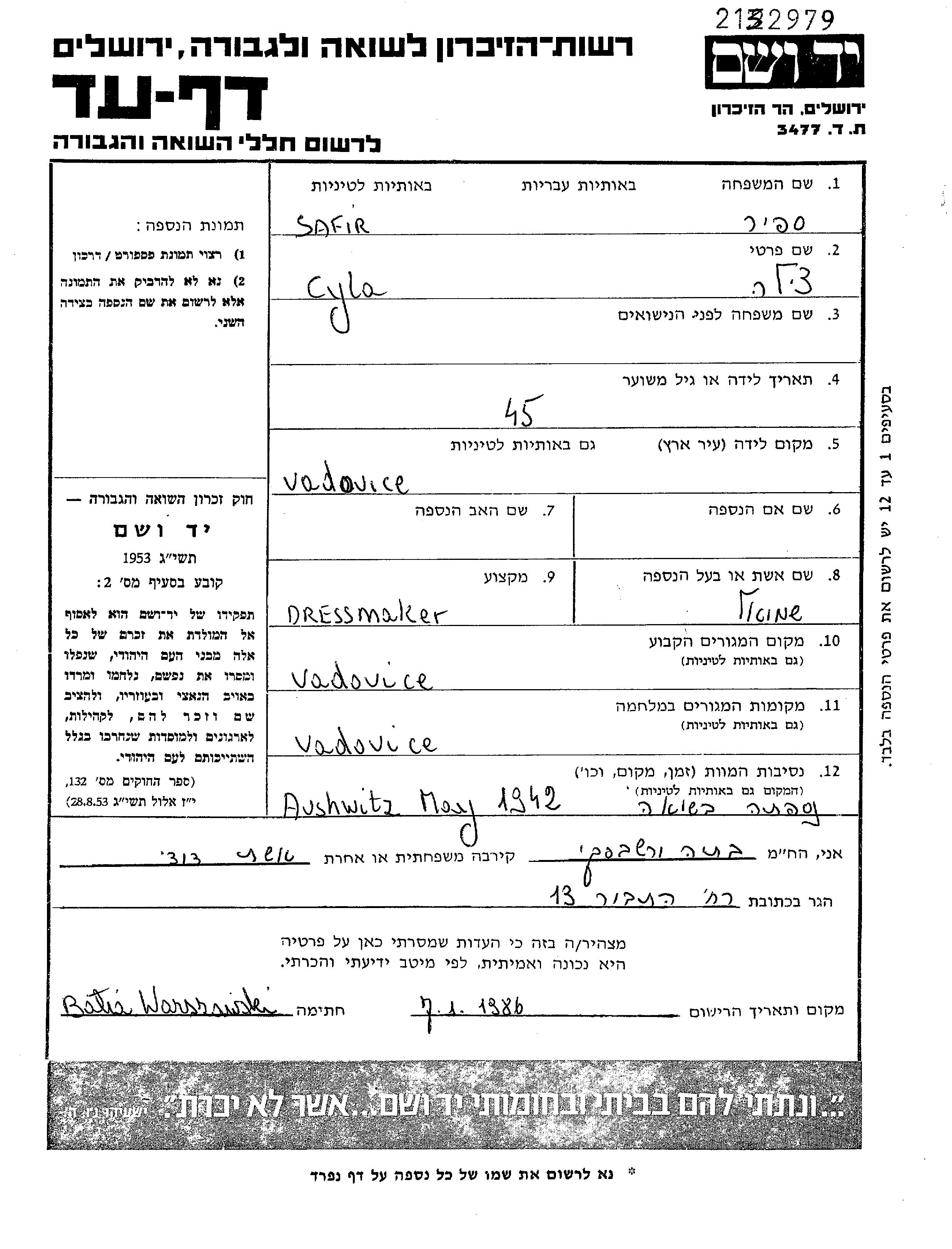 Cyla Safir wurde in Wadowice, Polen geboren. Sie war Schneiderin und mit Smuel Verheiratet. Vor dem Zweiten Weltkrieg lebte sie in Wadowice, Polen. Während des Krieges war sie in Wadowice, Polen.