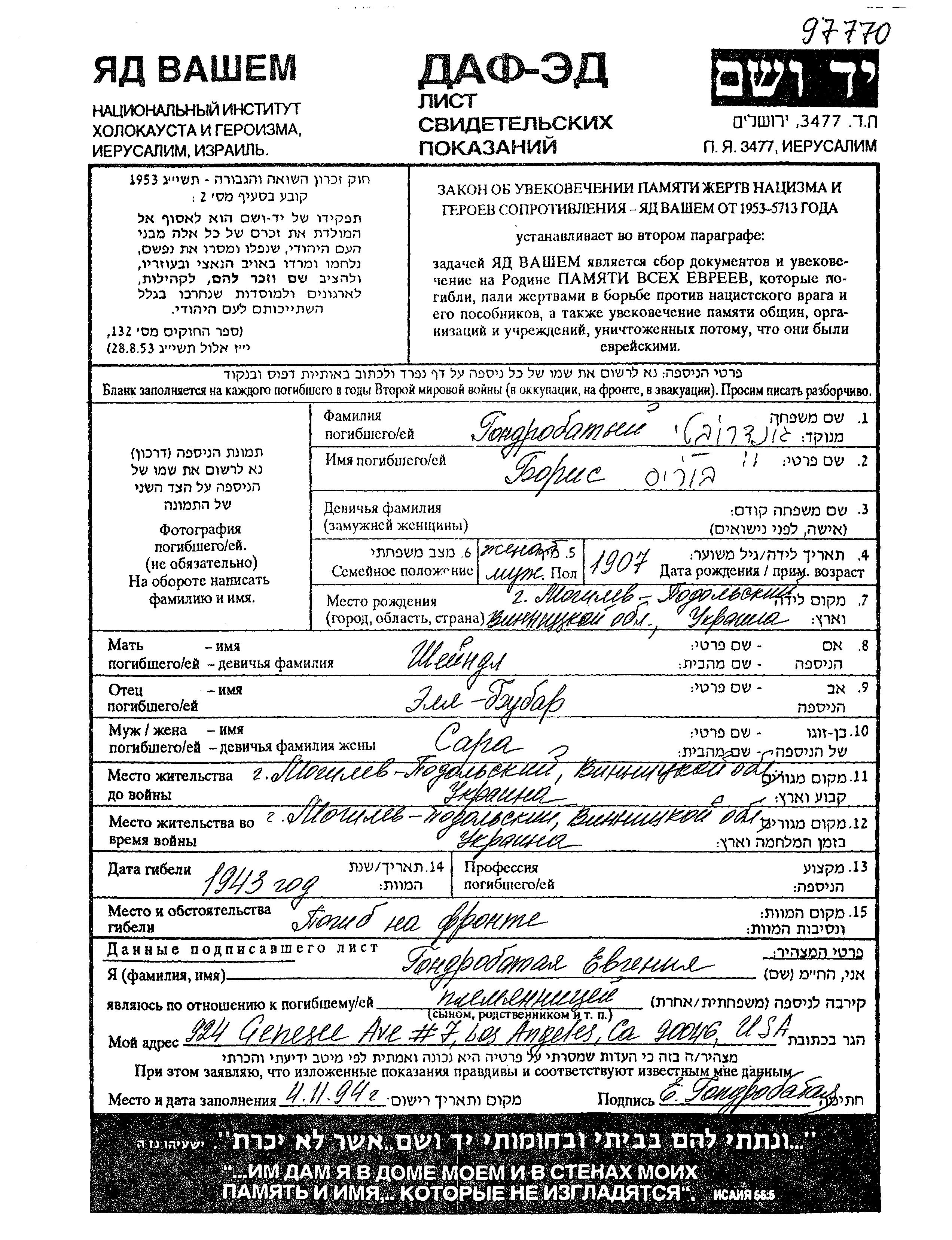 Boris im Militärdienst umgekommen. Todesort: unbekannt im Jahr 1943.