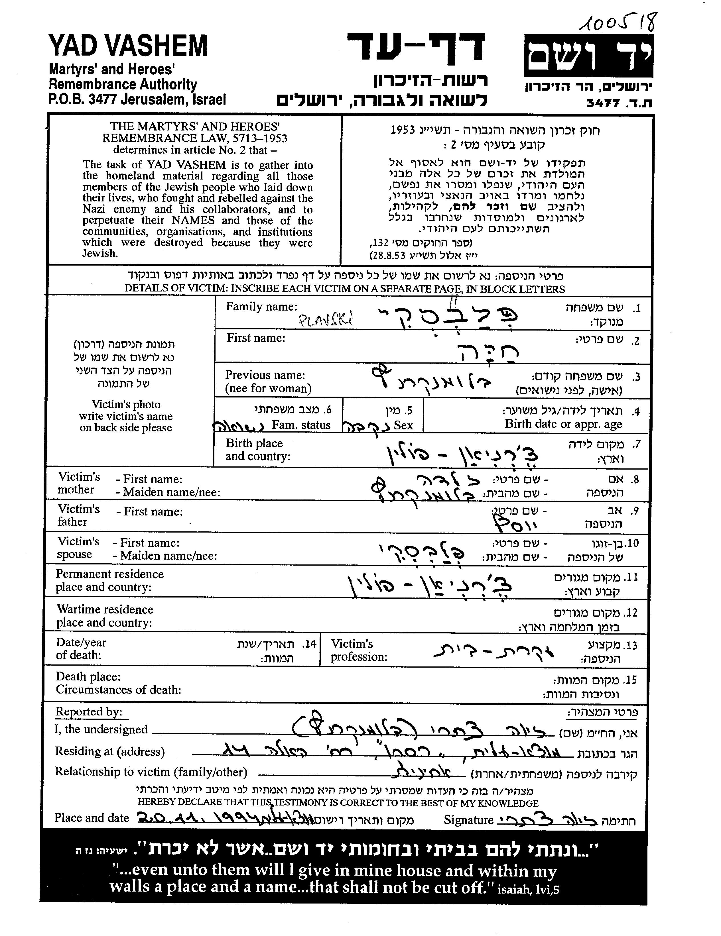 Chaya Plavski Palevski, geb. Blumenkrantz wurde in Czerniany, Polen geboren. Sie war die Tochter von Josef und Zelda. Sie war Hausfrau und Verheiratet. Vor dem Zweiten Weltkrieg lebte sie in Czerniany, Polen. Während des Krieges war sie in Czerniany, Polen.
