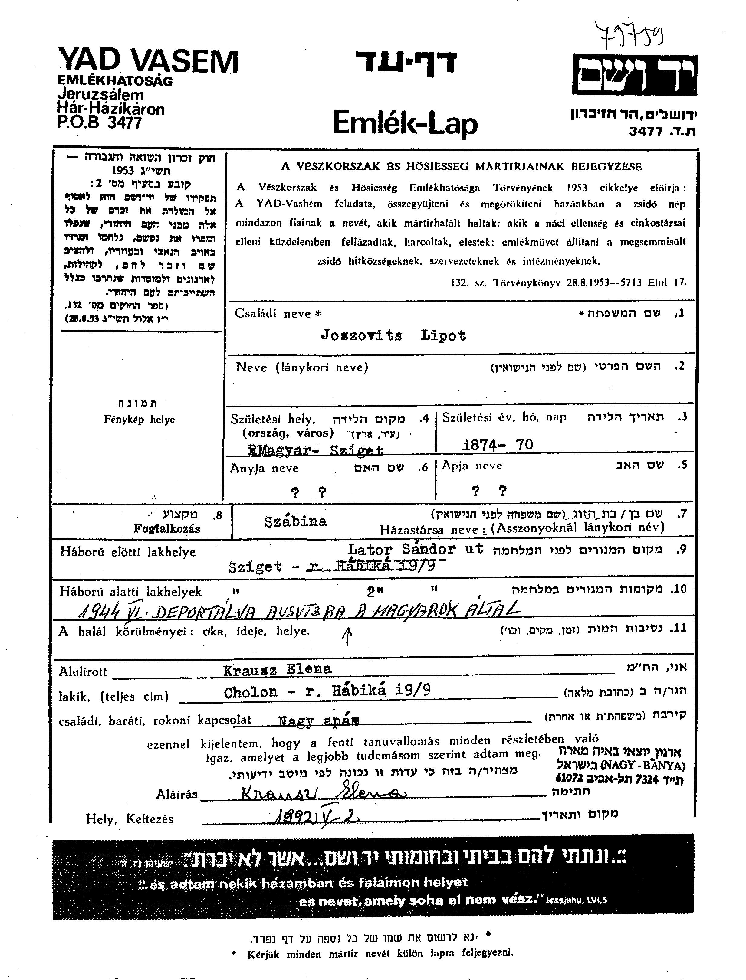Lipot Joszovits wurde im Jahr 1874 in Maramarossziget, Rumänien geboren. Er war mit Szabina Verheiratet. Vor dem Zweiten Weltkrieg lebte er in Maramarossziget, Rumänien. Während des Krieges war er in Maramarossziget, Rumänien.