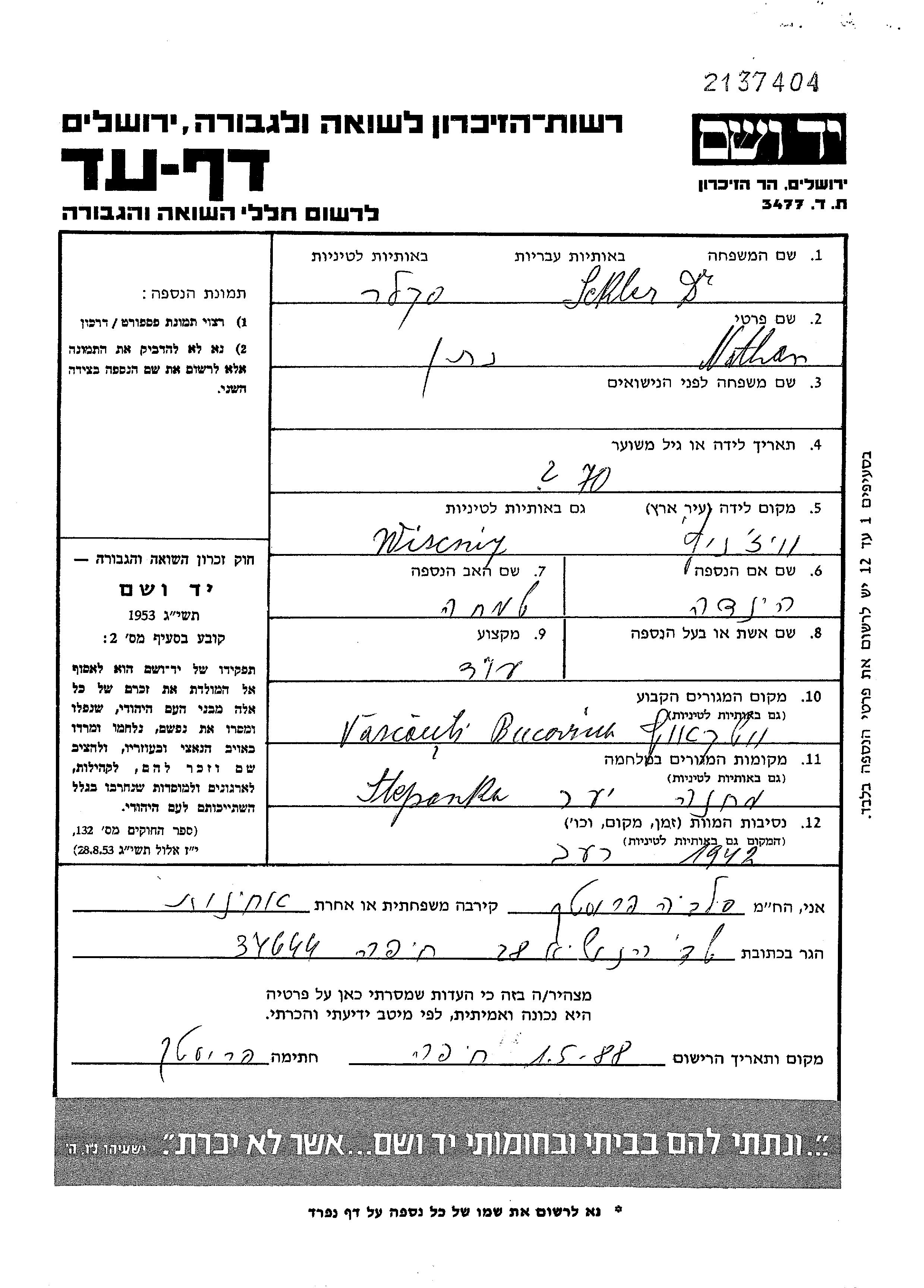 Dr. Nathan Sckler Skaler wurde in Wiznitz, Rumänien geboren. Er war der Sohn von Simkha und Hinda. Er war Rechtsanwalt/rechtsanwältin. Vor dem Zweiten Weltkrieg lebte er in Vascauti, Rumänien. Während des Krieges war er in Ukraine (UdSSR).