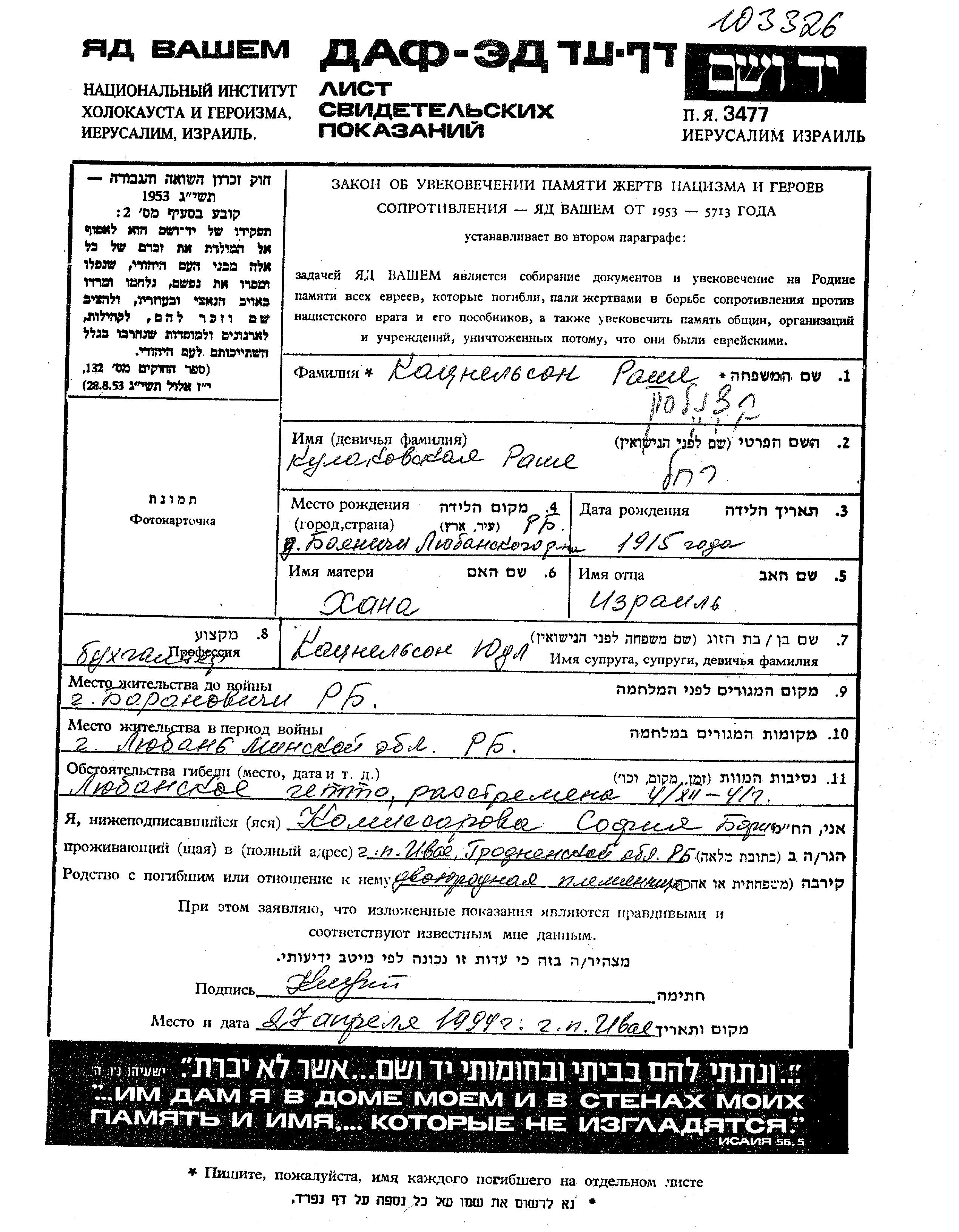 Rashe Katznelson, geb. Kulakovski wurde im Jahr 1915 in Wojutycze, Polen geboren. Sie war die Tochter von Izrail und Khana. Sie war Buchhalter/-in und mit Yudl Verheiratet. Vor dem Zweiten Weltkrieg lebte sie in Baranowicze, Polen. Während des Krieges war sie in Lyuban, Weißrussland (UdSSR).
