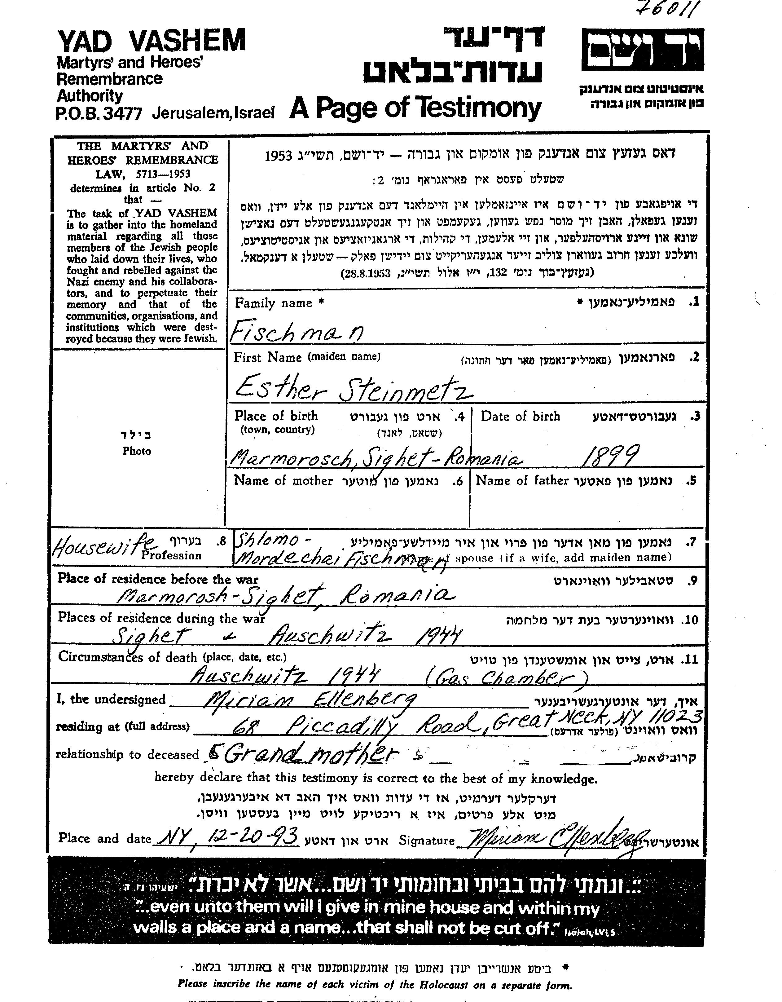 Ester Fischman, geb. Steinmetz wurde im Jahr 1899 in Maramarossziget, Rumänien geboren. Sie war Hausfrau und mit Mordechai Shlomo Verheiratet. Vor dem Zweiten Weltkrieg lebte sie in Maramarossziget, Rumänien. Während des Krieges war sie in Maramarossziget, Rumänien.