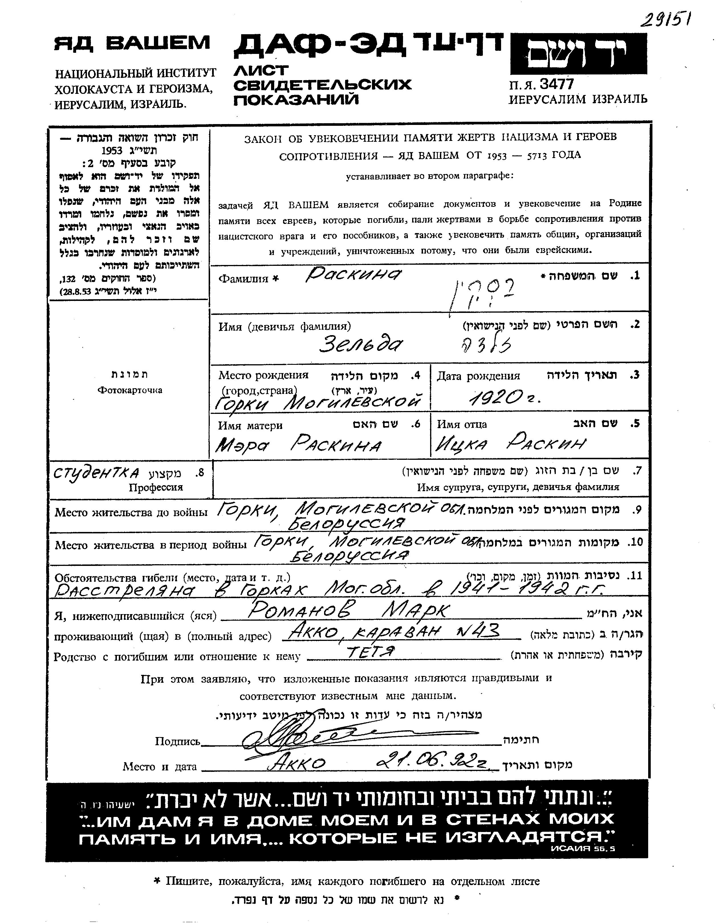 Zelda Raskin wurde im Jahr 1920 in Gorki, Weißrussland (UdSSR) geboren. Sie war die Tochter von Itzka Itzka und Mera, geb. Sheinin. Sie war Student. Vor dem Zweiten Weltkrieg lebte sie in Gorki, Weißrussland (UdSSR). Während des Krieges war sie in Gorki, Weißrussland (UdSSR).