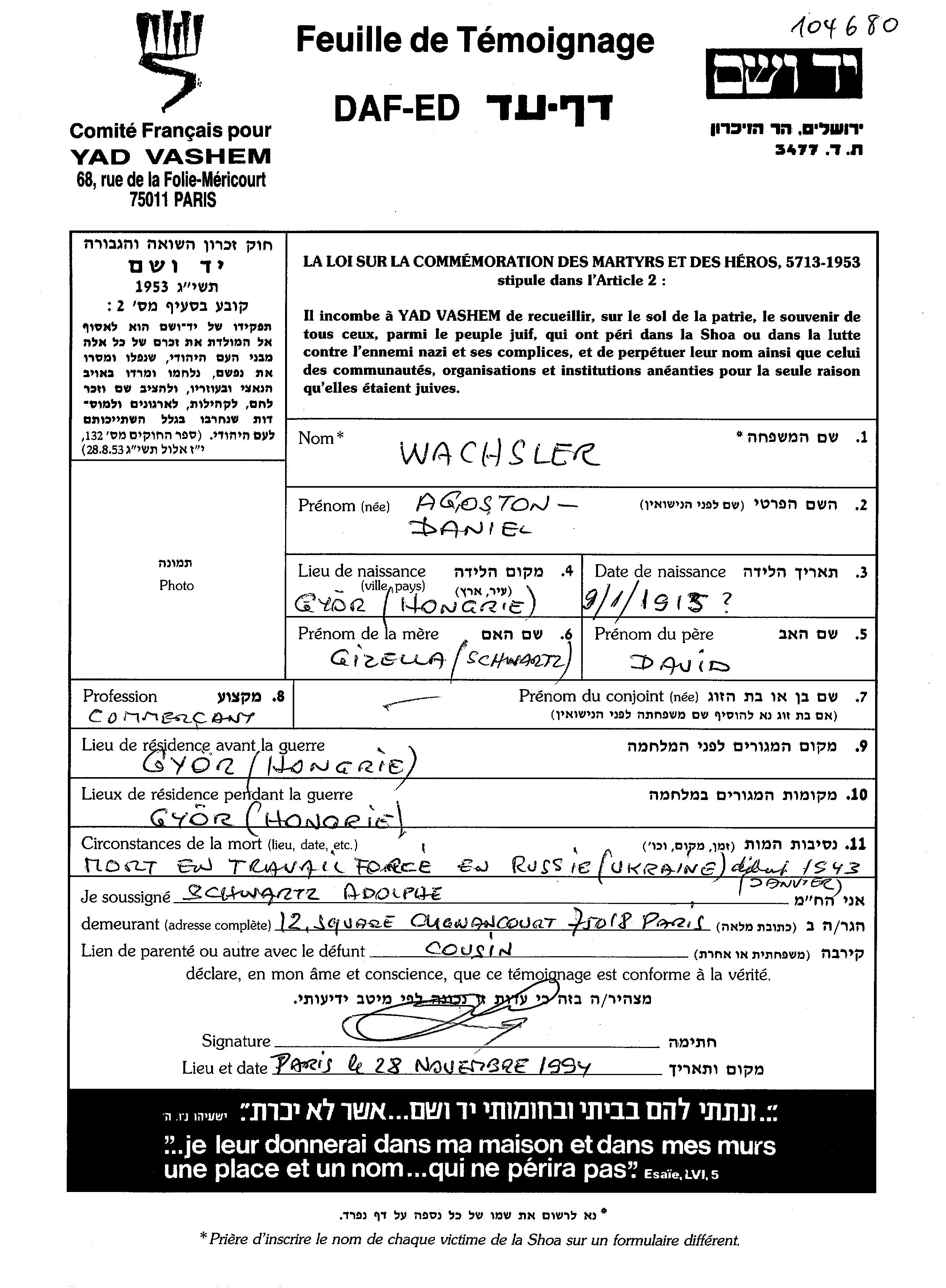 Agoston Daniel Wachsler wurde im Jahr 1915 in Gyor, Ungarn geboren. Er war der Sohn von David und Gizella. Er war Kaufmann/-frau und Ledig. Vor dem Zweiten Weltkrieg lebte er in Gyor, Ungarn. Während des Krieges war er in Gyor, Ungarn.
