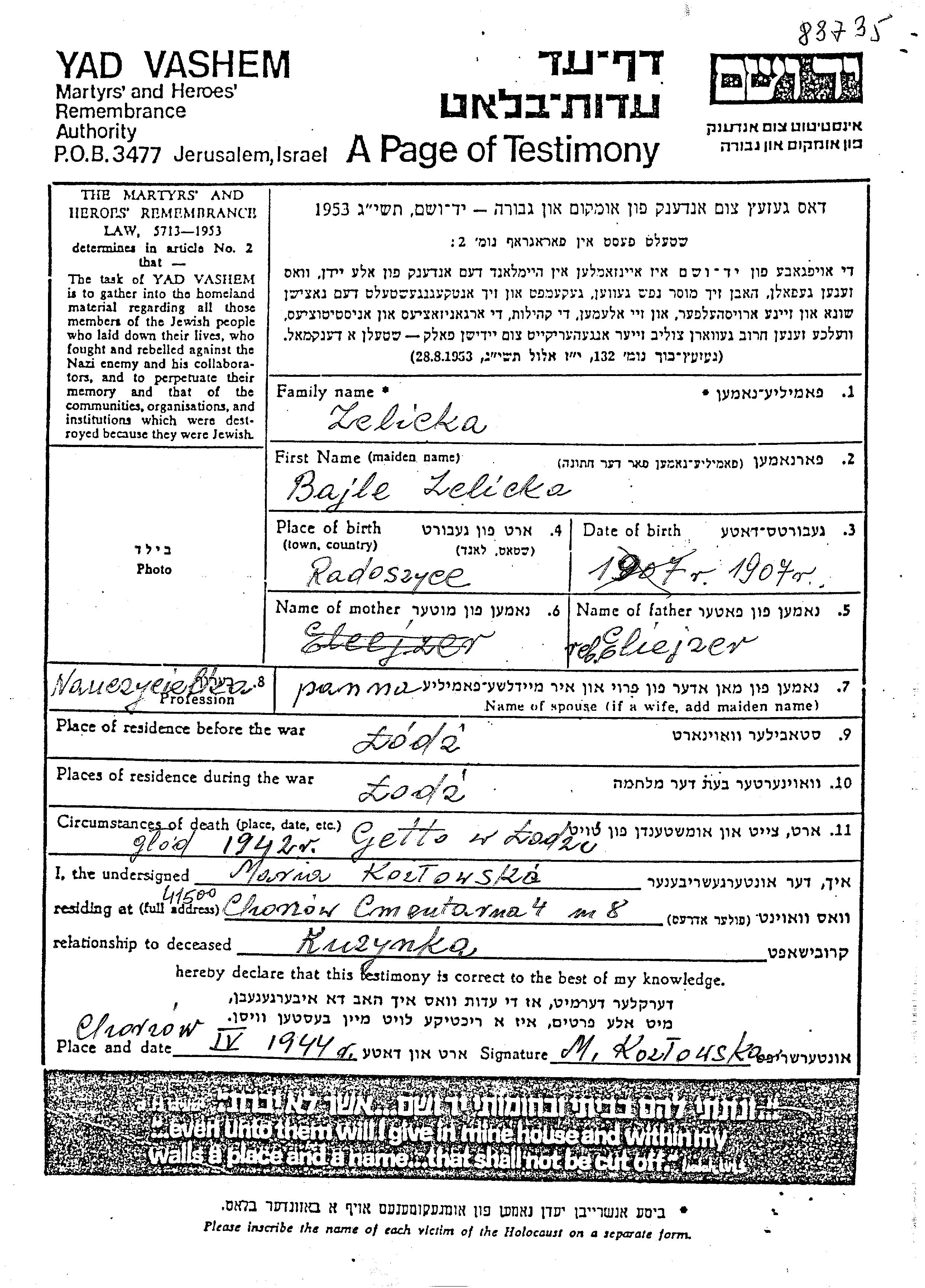 Bajle Zelicki wurde im Jahr 1907 in Radoszyce, Polen geboren. Sie war die Tochter von Eliejzer. Sie war Lehrer/in und Ledig. Vor dem Zweiten Weltkrieg lebte sie in Lodz, Polen. Während des Krieges war sie in Lodz, Polen.
