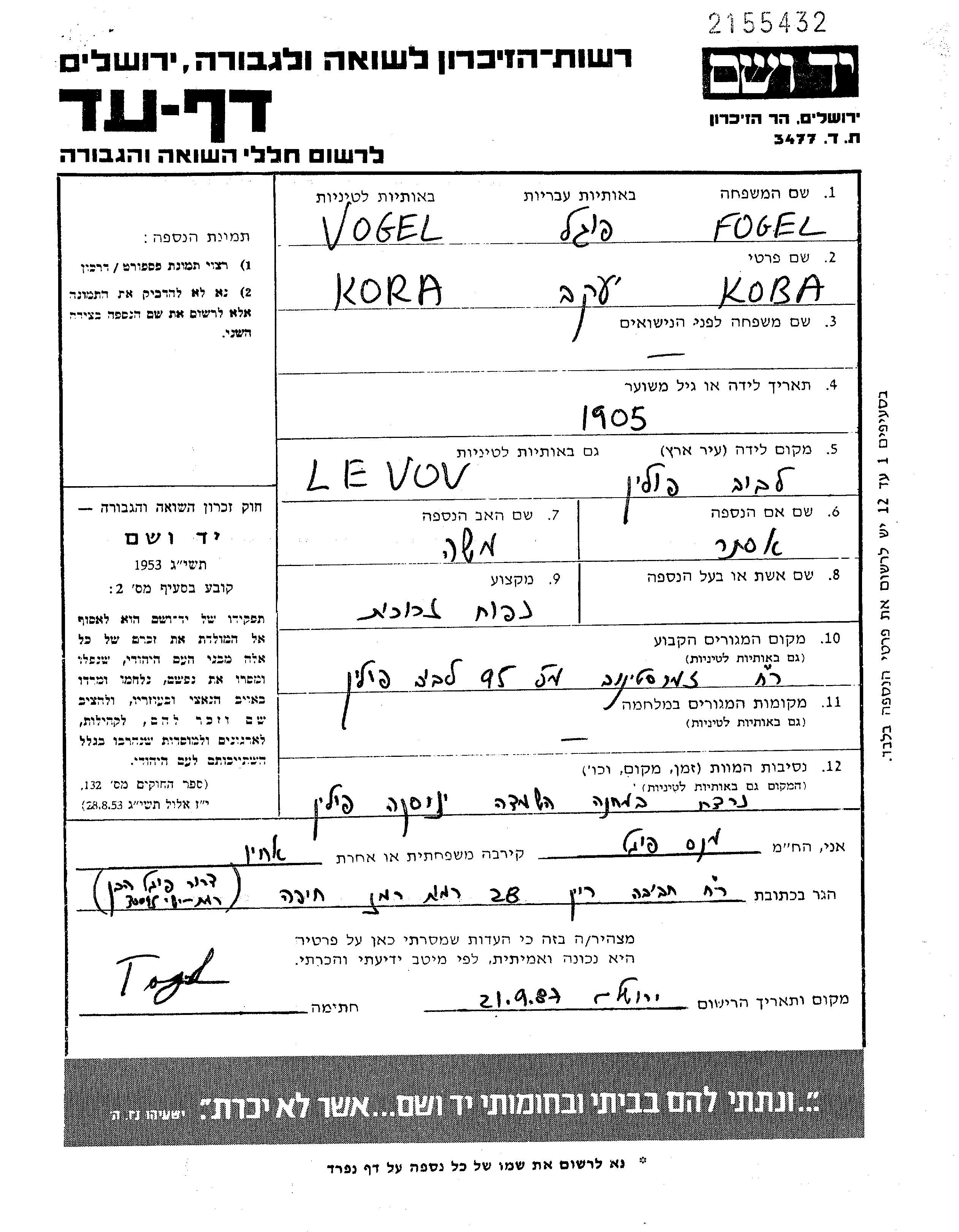 Koba Kora Vogel wurde im Jahr 1905 in Lwow, Polen geboren. Er war der Sohn von Moshe Mozi und Aester, geb. Izraeli. Er war Glaser/-in. Vor dem Zweiten Weltkrieg lebte er in Lwow, Polen. Während des Krieges war er in Lwow, Polen.