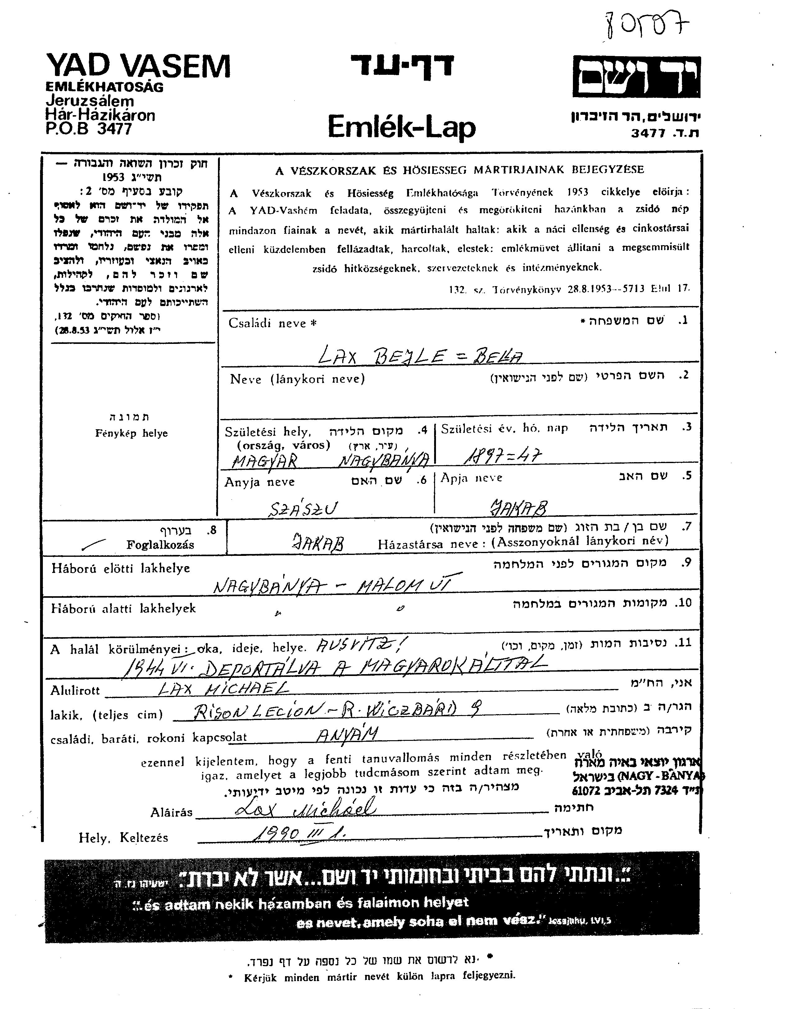 Bejle Lax wurde im Jahr 1897 in Nagybánya, Rumänien geboren. Sie war die Tochter von Jakab und Szaszu. Sie war mit Jakab Verheiratet. Vor dem Zweiten Weltkrieg lebte sie in Nagybánya, Rumänien. Während des Krieges war sie in Nagybánya, Rumänien.