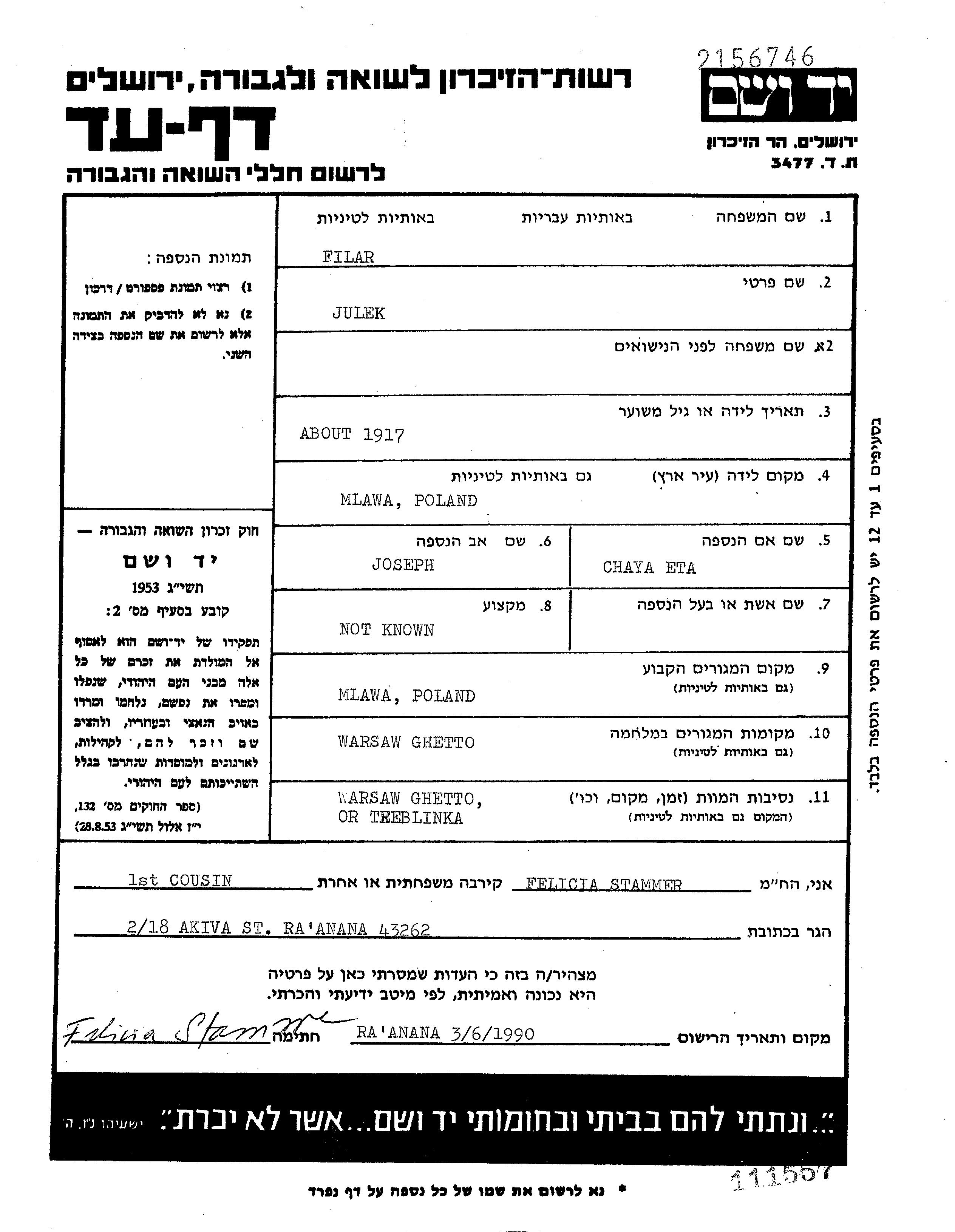 Julek Filar wurde im Jahr 1917 in Mlawa, Polen geboren. Er war der Sohn von Joseph und Chaya Eta, geb. Lipinski. Vor dem Zweiten Weltkrieg lebte er in Mlawa, Polen. Während des Krieges war er in Warszawa, Polen.