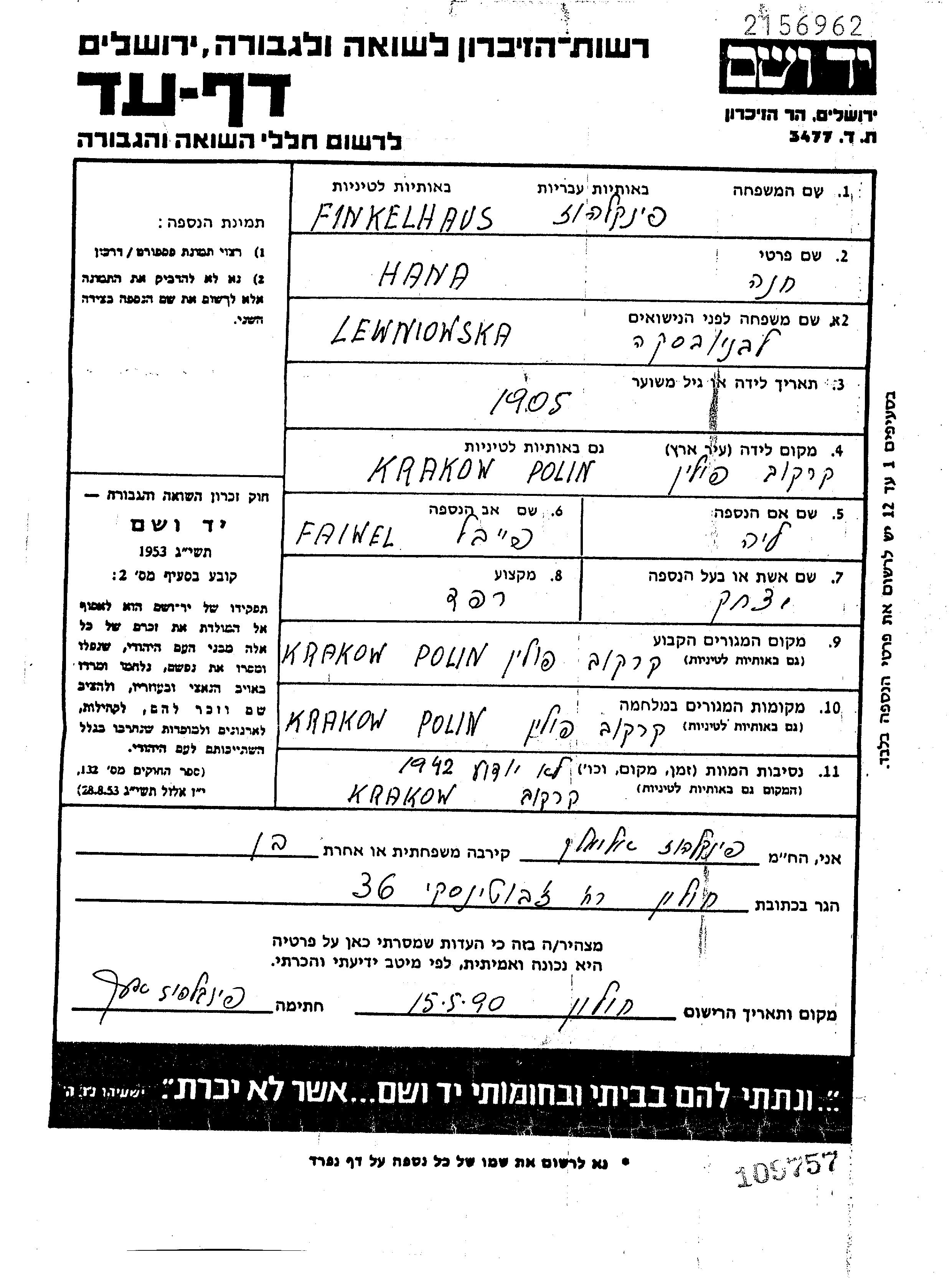 Hana Finkelhaus, geb. Lewniowska wurde im Jahr 1905 in Krakow, Polen geboren. Sie war die Tochter von Faiwel und Lea. Sie war Polsterer/-in und mit Ytzkhak Verheiratet. Vor dem Zweiten Weltkrieg lebte sie in Krakow, Polen. Während des Krieges war sie in Krakow, Polen.