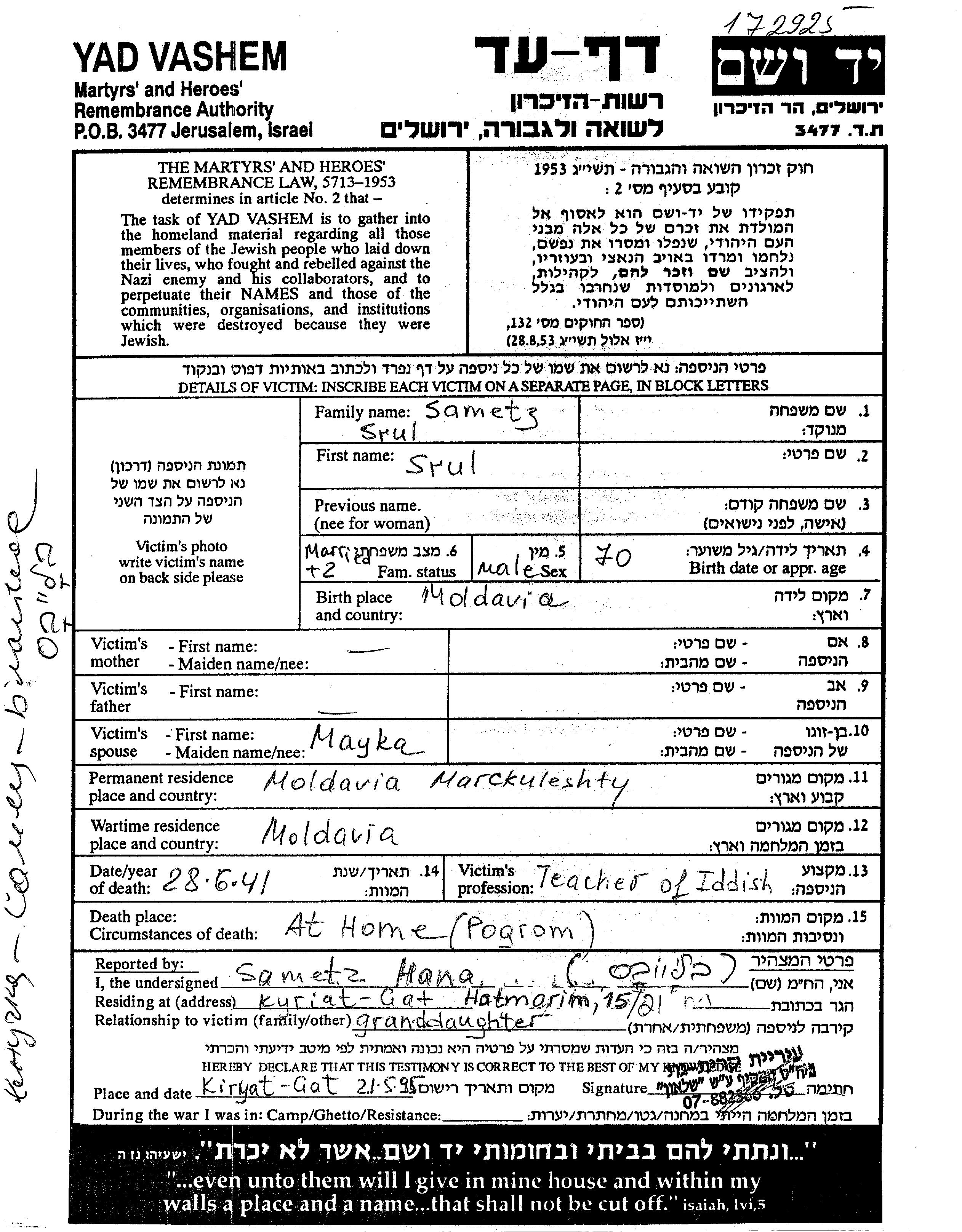 Srul Sametz wurde im Jahr 1871 in Moldavia, Ukraine (UdSSR) geboren. Er war Chederlehrer und mit Mayka Verheiratet. Vor dem Zweiten Weltkrieg lebte er in Marculesti, Rumänien. Während des Krieges war er in Moldavia, Ukraine (UdSSR).