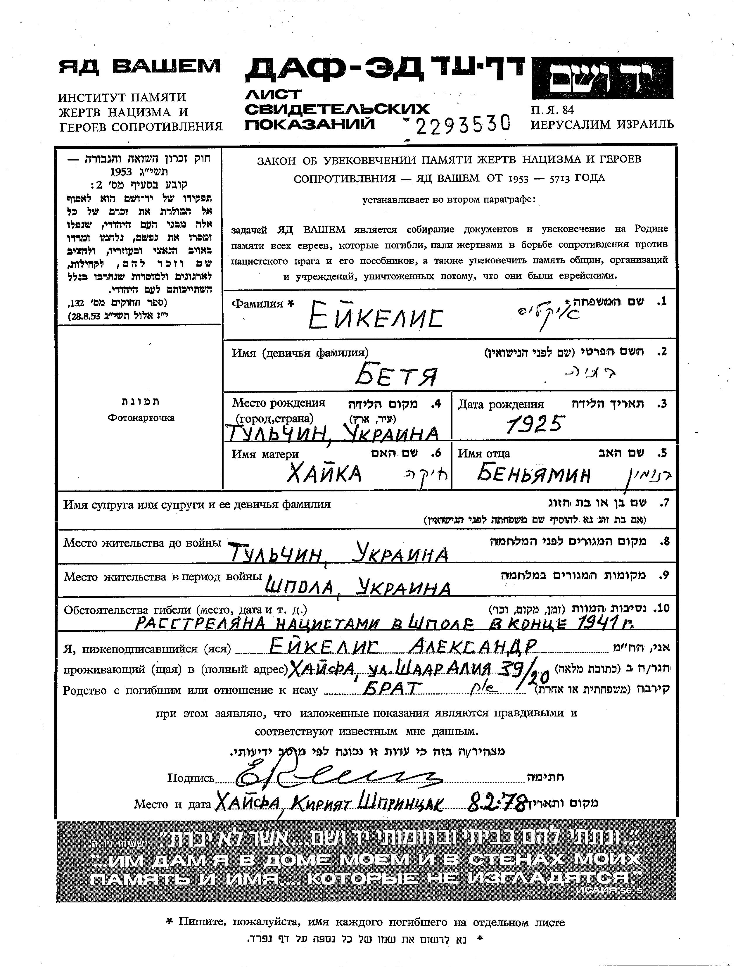 Betya Eikelis wurde im Jahr 1925 in Tulchin, Ukraine (UdSSR) geboren. Sie war die Tochter von Benyamin und Khaika, geb. Spektor. Sie war Kind. Vor dem Zweiten Weltkrieg lebte sie in Tulchin, Ukraine (UdSSR). Während des Krieges war sie in Shpola, Ukraine (UdSSR).
