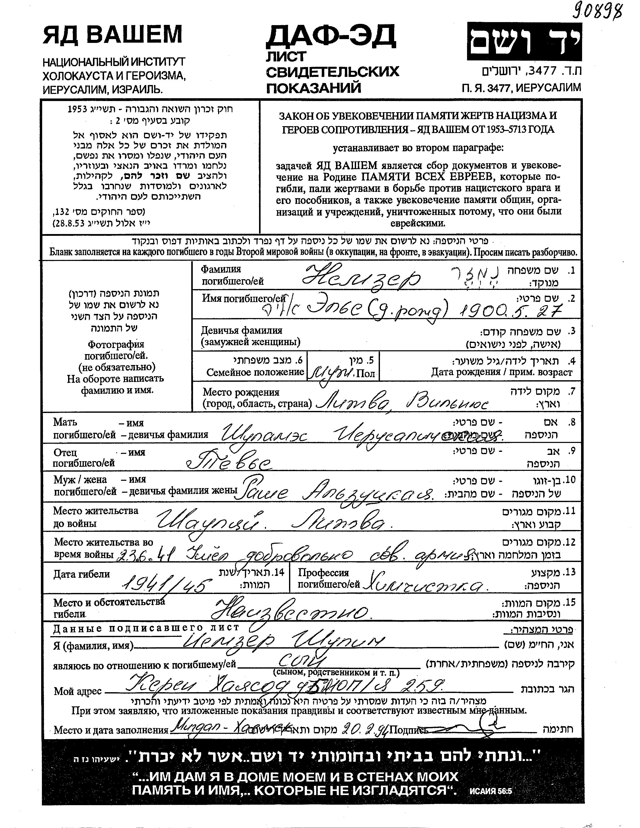 Elye Alia Nemzer wurde im Jahr 1900 in Vilnius, Polen geboren. Er war der Sohn von Tevie und Shulames, geb. Iyerusalimski. Er war Arbeiter/-in und mit Rashe Verheiratet. Vor dem Zweiten Weltkrieg lebte er in Siauliai, Litauen. Während des Krieges war er in die Sowjetischen Streitkräfte. Elye Alia im Militärdienst umgekommen. Todesort: unbekannt im Jahr 1942.