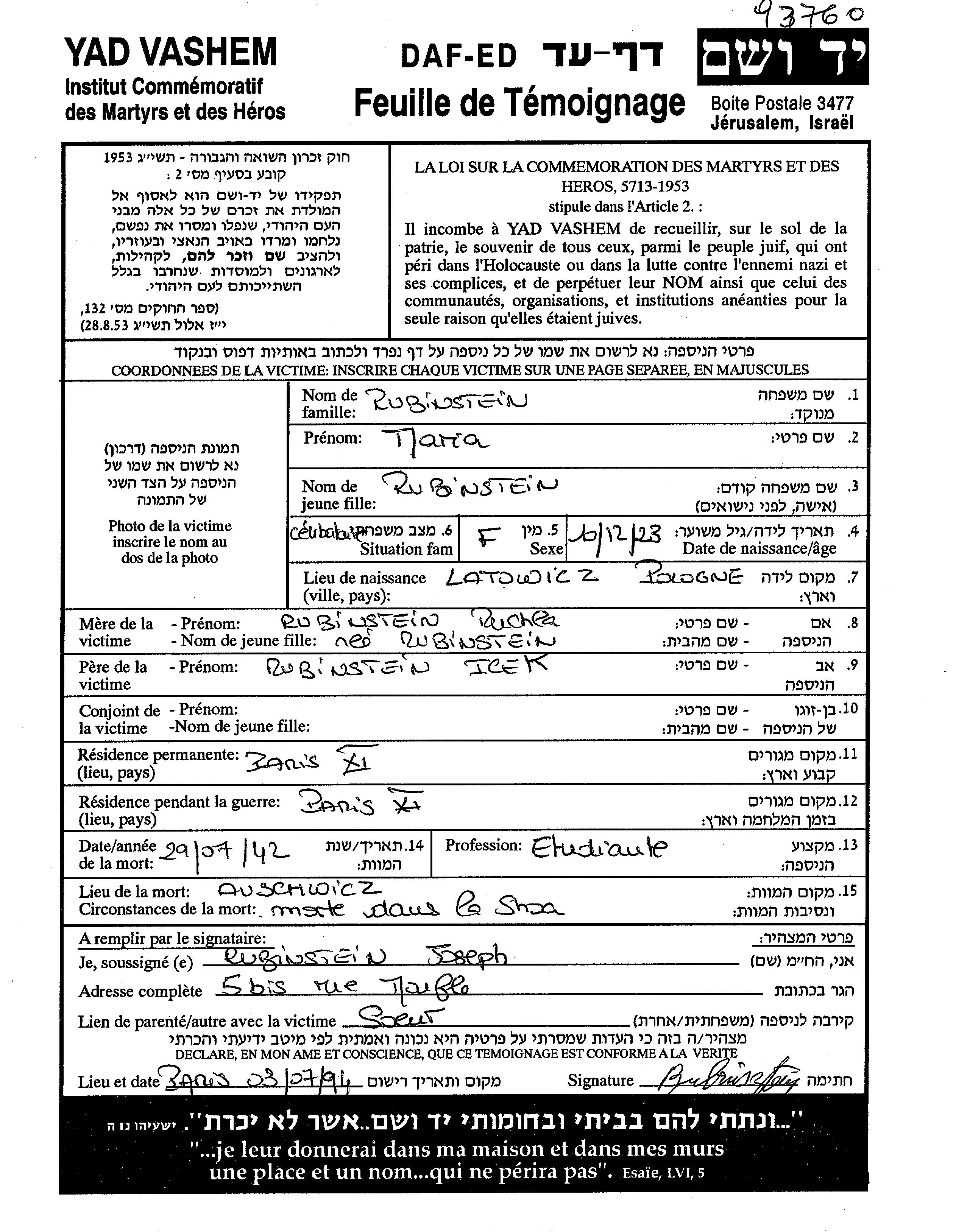 Maria Rubinstein wurde im Jahr 1923 in Latowicz, Polen geboren. Sie war die Tochter von Icek und Rochla, geb. Rubinsztein. Sie war Student und Ledig. Vor dem Zweiten Weltkrieg lebte sie in Paris, Frankreich. Während des Krieges war sie in Paris, Frankreich.