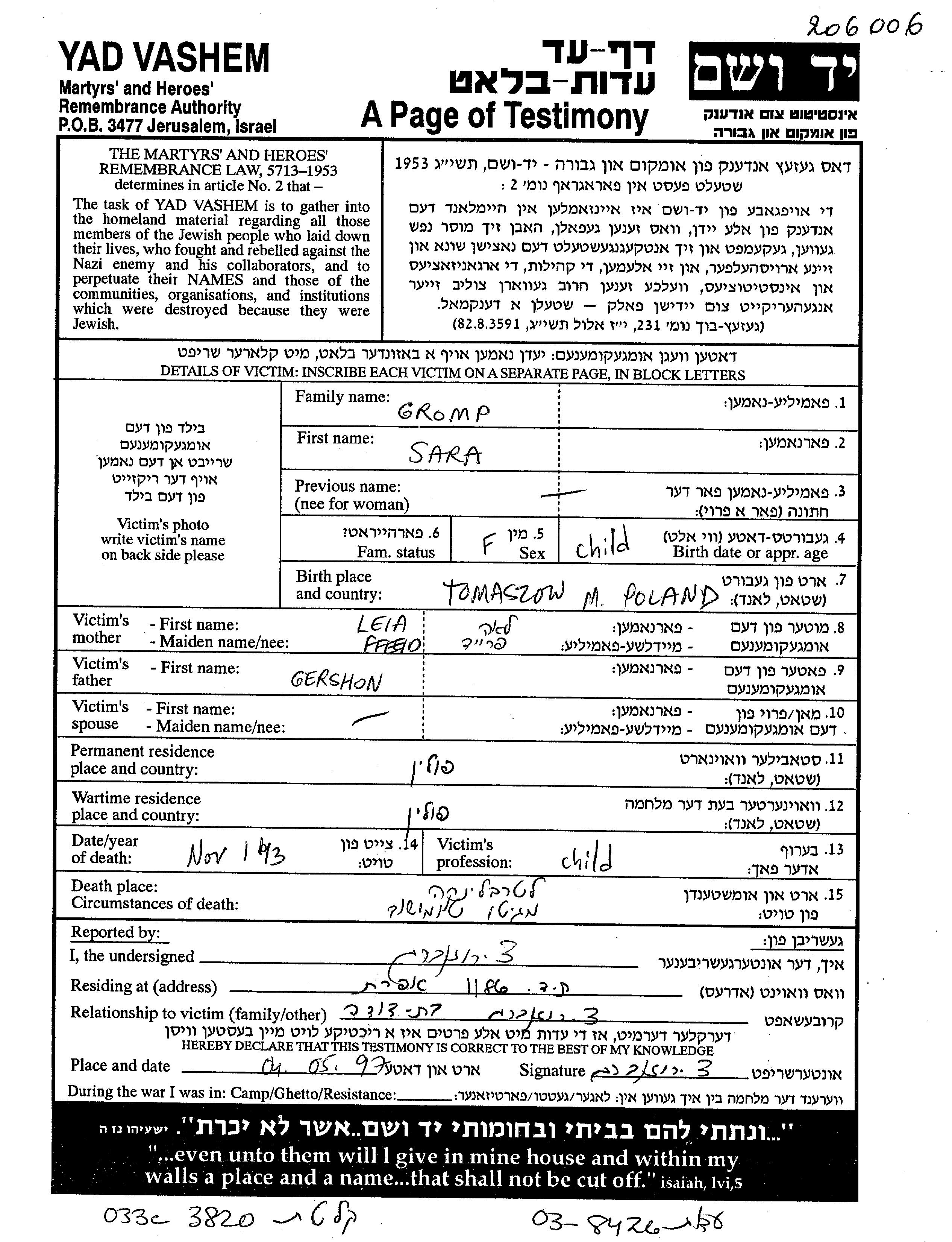 Sara Gromp wurde in Tomaszow Mazowiecki, Polen geboren. Sie war die Tochter von Gershon und Leia, geb. Freid. Sie war Kind. Vor dem Zweiten Weltkrieg lebte sie in Polen. Während des Krieges war sie in Tomaszow Mazowiecki, Polen.