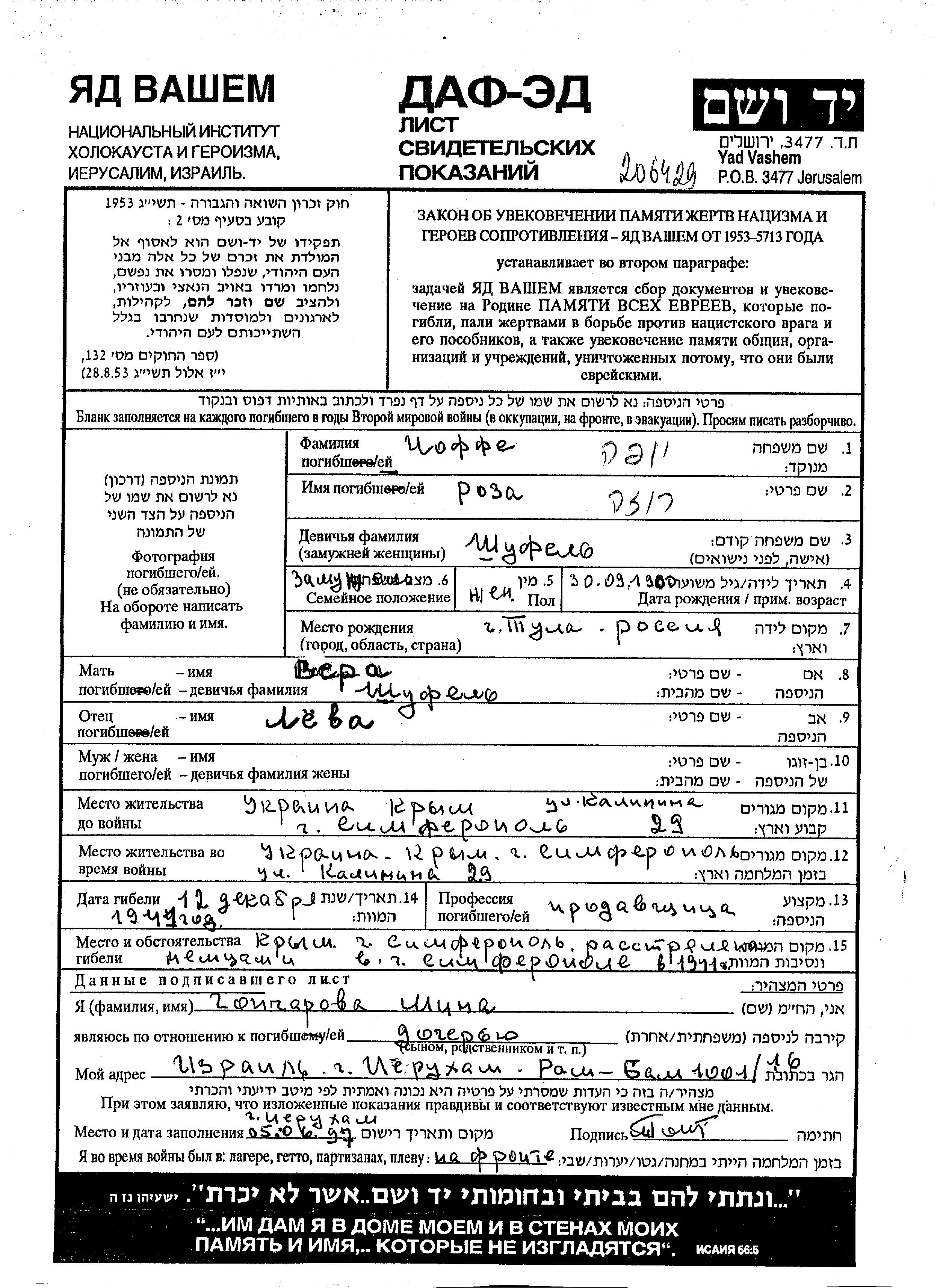 Roza Iofe, geb. Shufel wurde im Jahr 1900 in Tula, Russland (UdSSR) geboren. Sie war die Tochter von Lyova Liuba und Vera. Sie war Verkäufer/-in und Verheiratet. Vor dem Zweiten Weltkrieg lebte sie in Simferopol, Russland (UdSSR). Während des Krieges war sie in Simferopol, Russland (UdSSR).