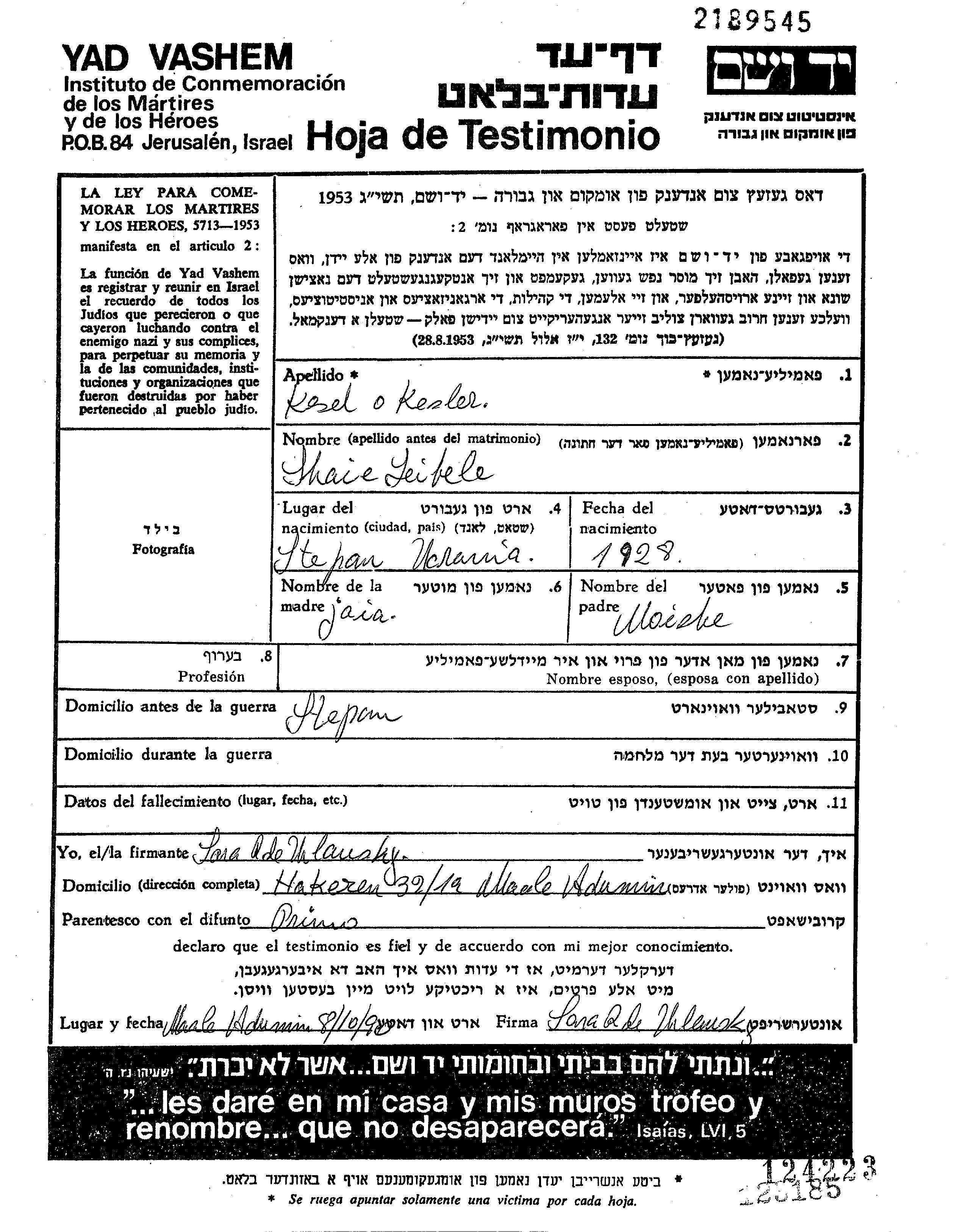 Leibel Shaie Kesel Kesler wurde im Jahr 1928 in Stepań, Polen geboren. Er war der Sohn von Moishe und Jaia. Er war Kind. Vor dem Zweiten Weltkrieg lebte er in Stepań, Polen.