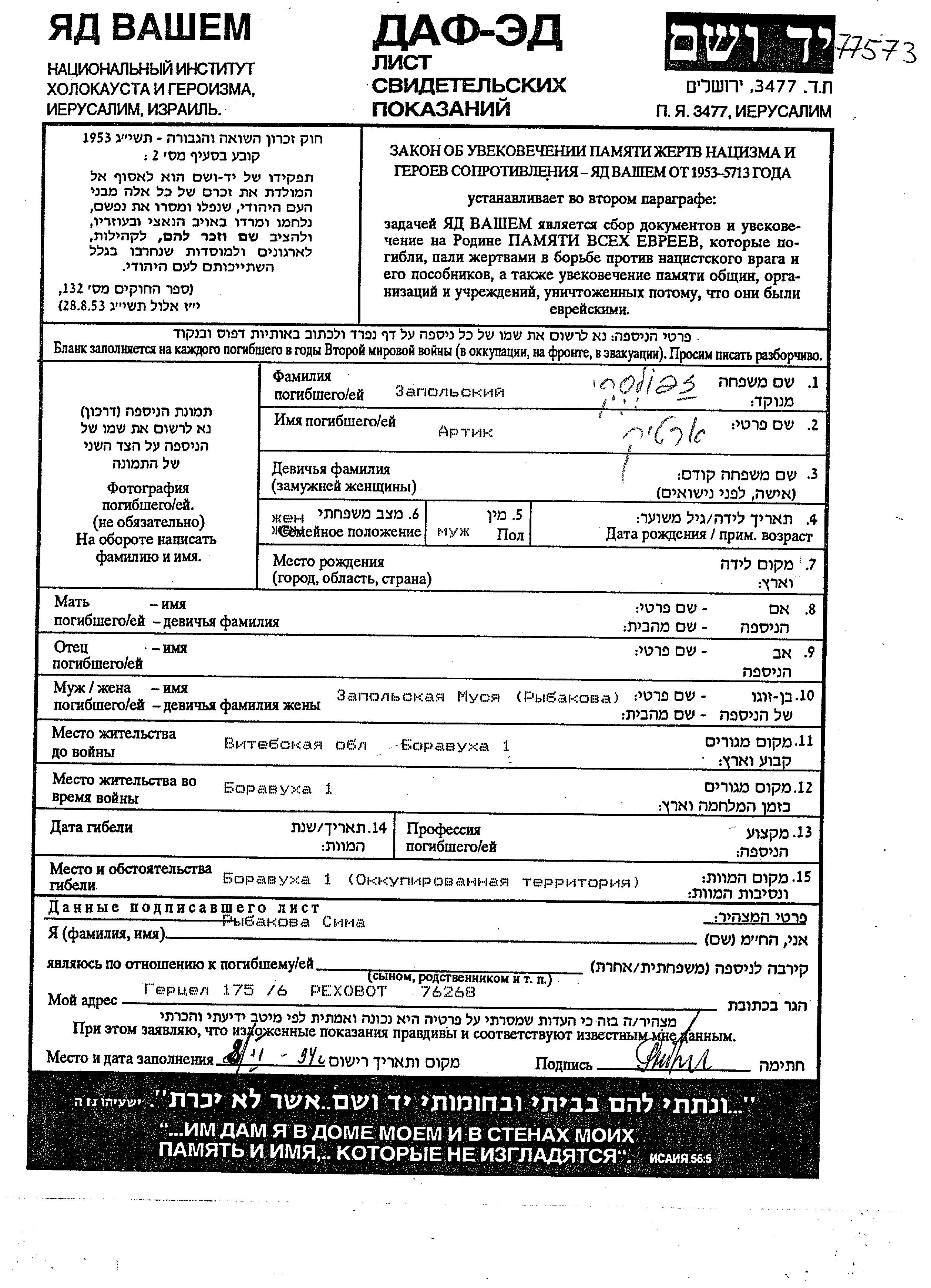 Artur Zapolski. Er war mit Musia Verheiratet. Vor dem Zweiten Weltkrieg lebte er in Borovukha, Weißrussland (UdSSR). Während des Krieges war er in Borovukha, Weißrussland (UdSSR).