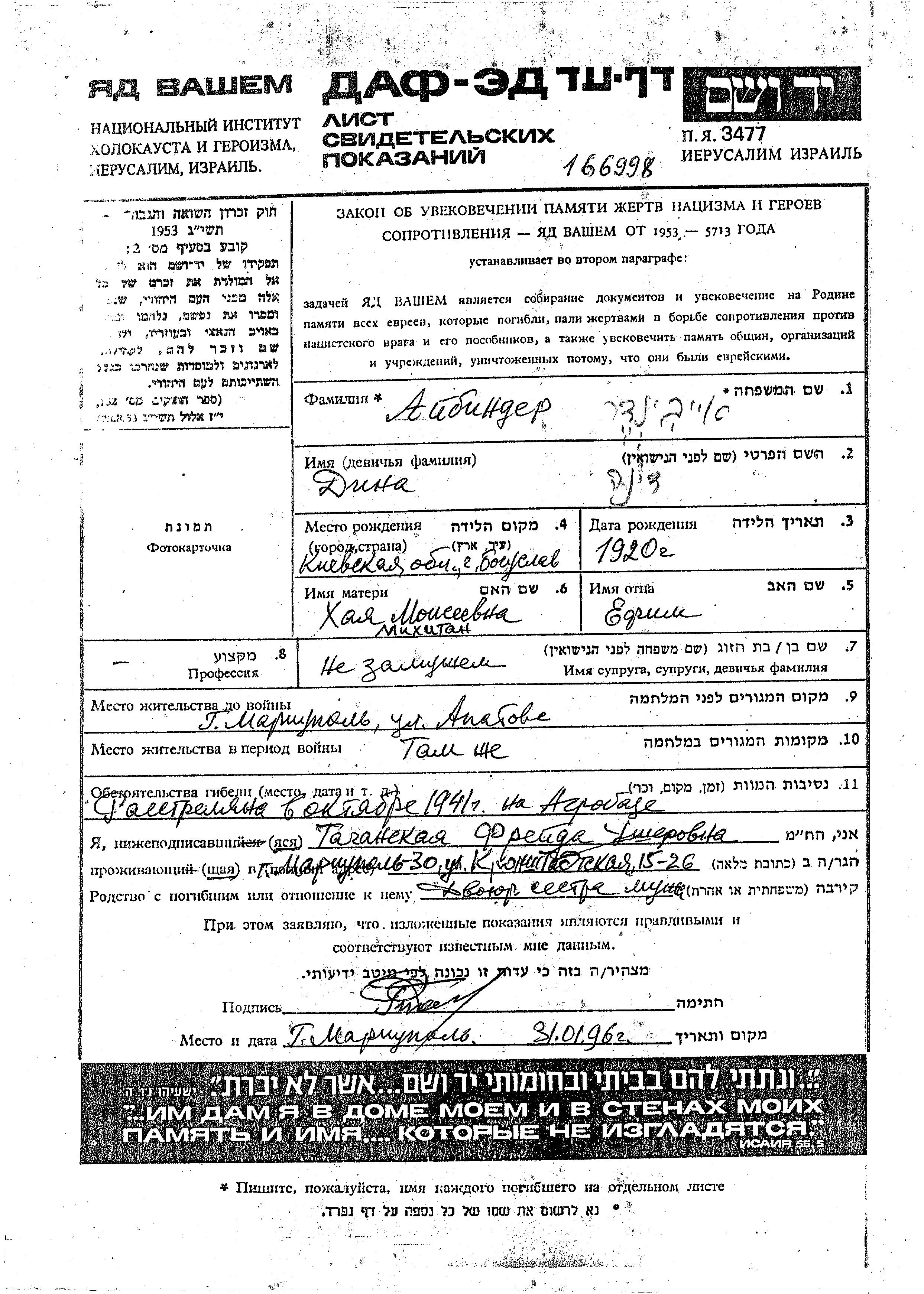 Dina Aibinder wurde im Jahr 1920 in Boguslav, Ukraine (UdSSR) geboren. Sie war die Tochter von Yefim und Khaia, geb. Mikhitan. Sie war Ledig. Vor dem Zweiten Weltkrieg lebte sie in Mariupol, Ukraine (UdSSR). Während des Krieges war sie in Mariupol, Ukraine (UdSSR).